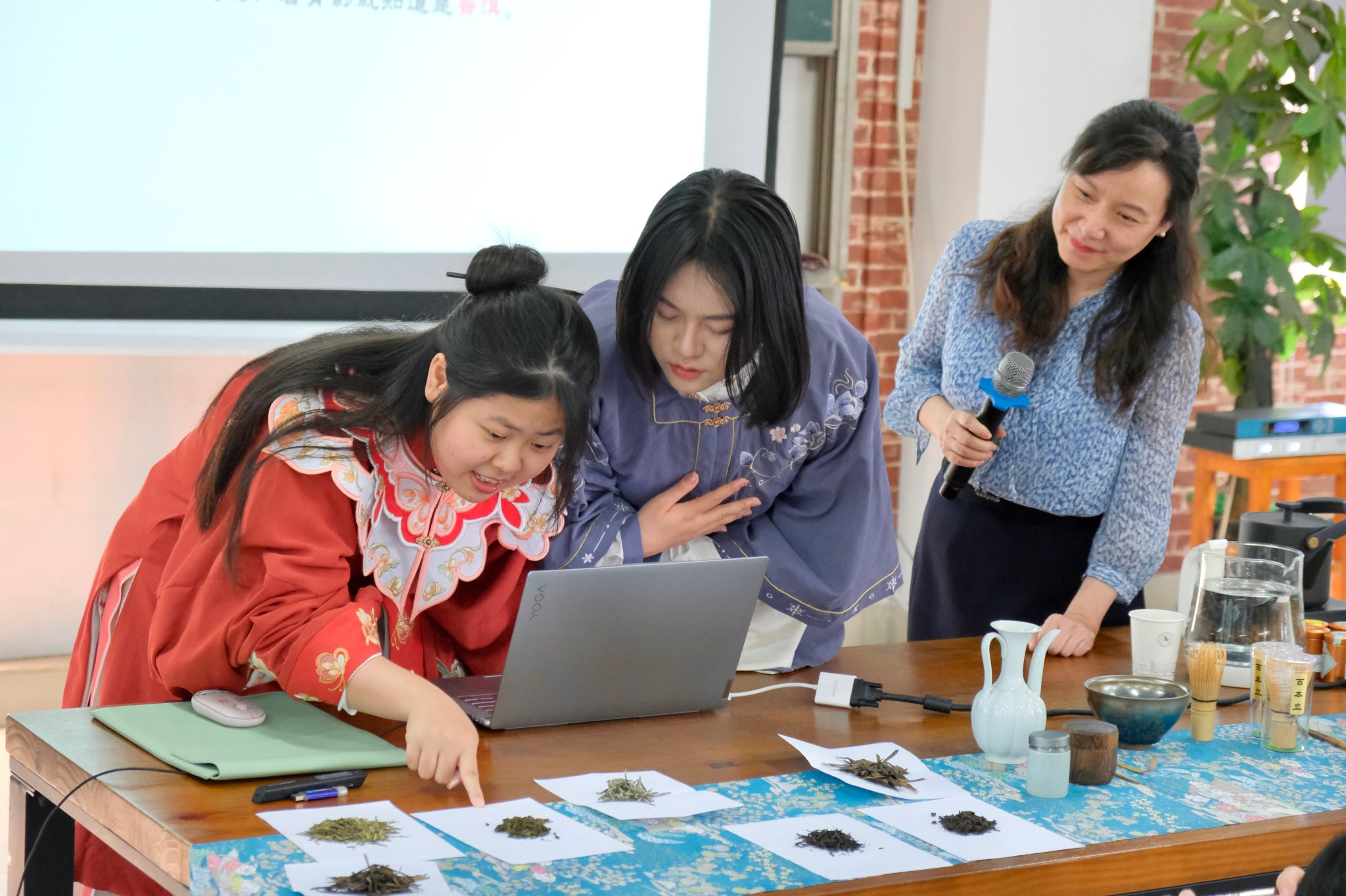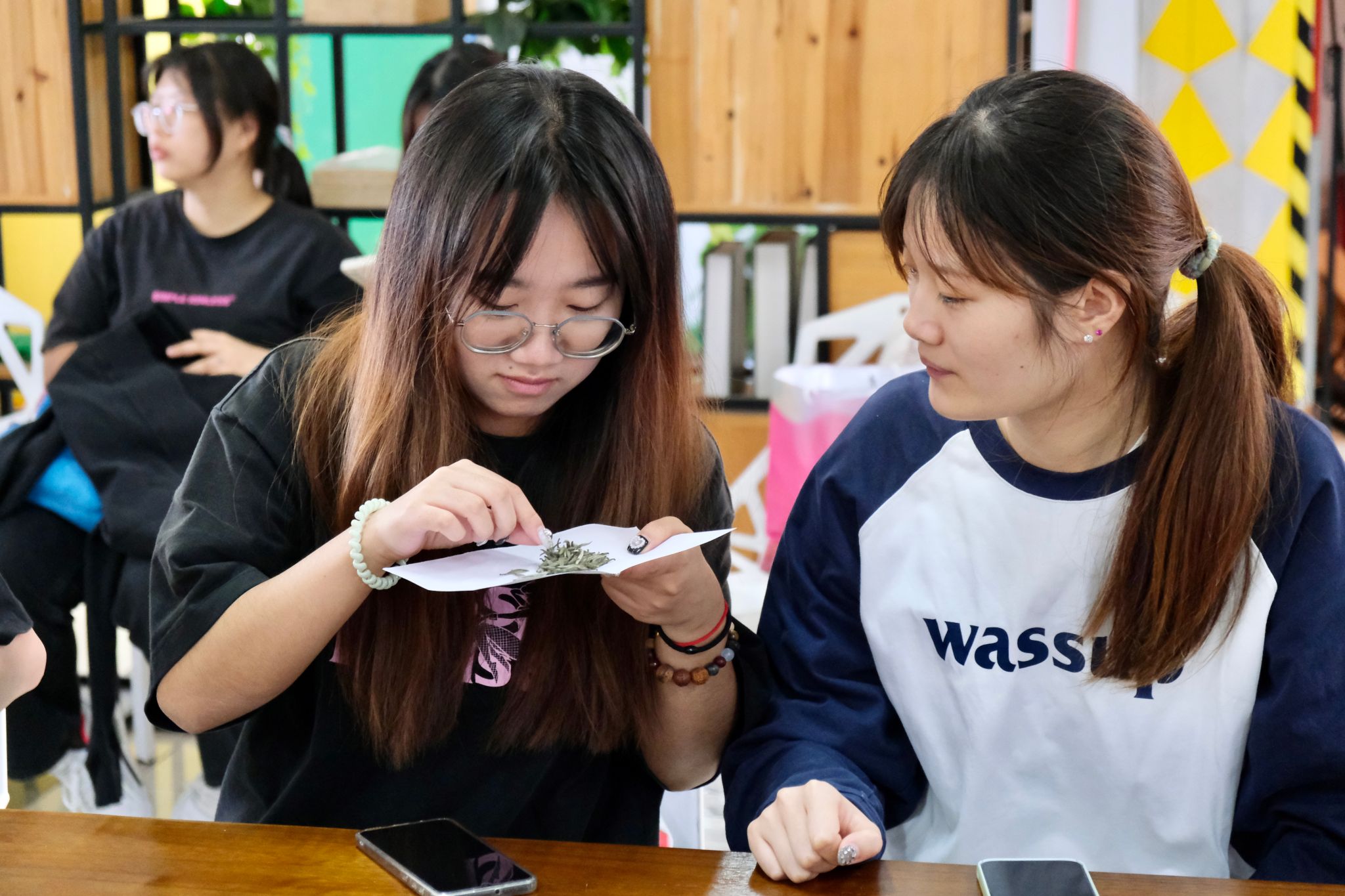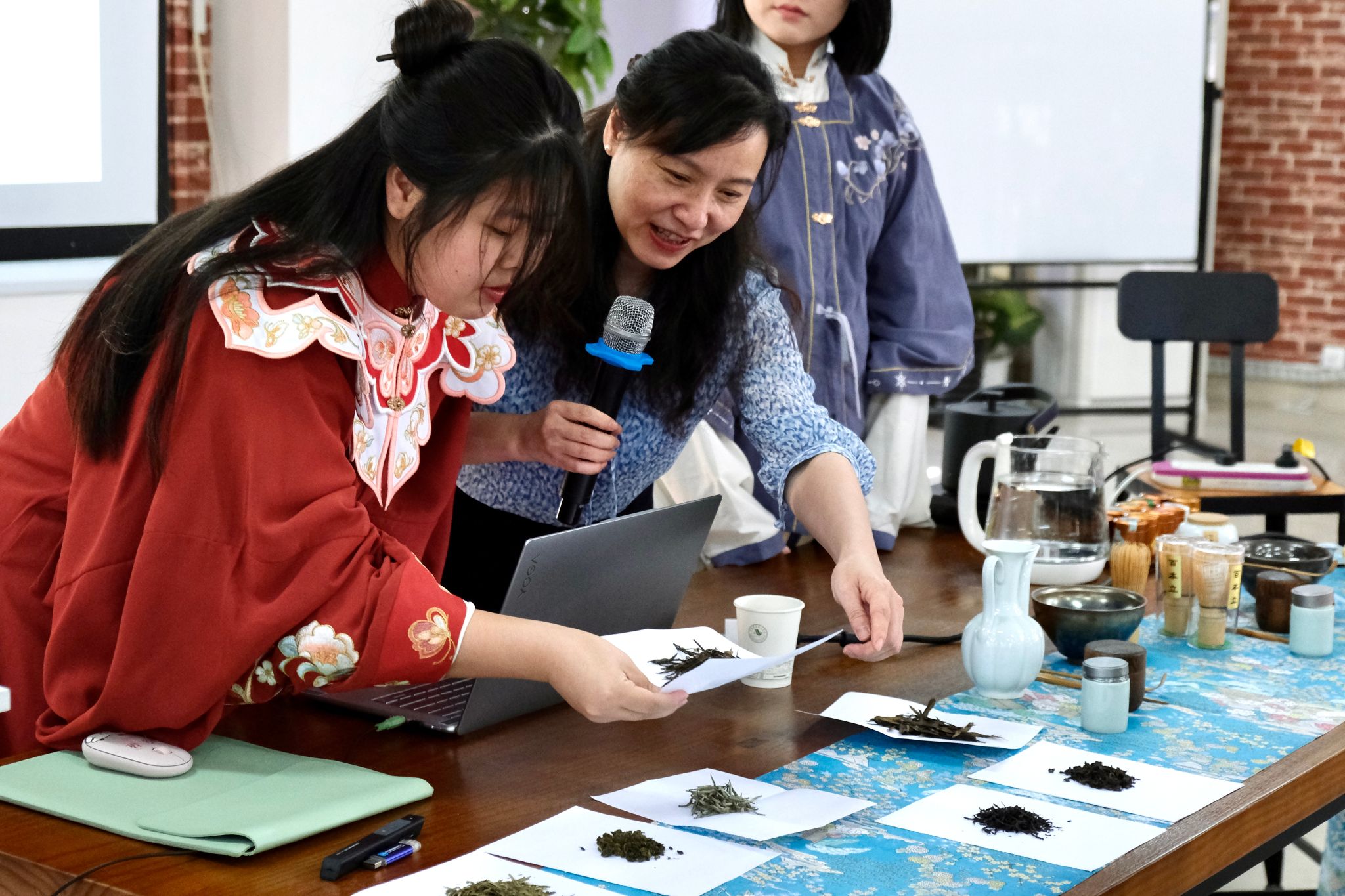 在介绍品茗环境时,刘晓芬提到茶兴于唐、盛于宋,明清时期广为流传并由此引出中国饮茶史。在阐述辨析茶叶的方法时,刘晓芬随机抽取两名同学现场尝试辨析茶叶,并传授同学们分辨茶叶的趣味口诀“烫个大卷叫铁观音,打扮的五颜六色的是金骏眉,少白头的是白毫银针……”。朗朗上口的口诀让学生们很快就熟悉了各种形态的茶叶。