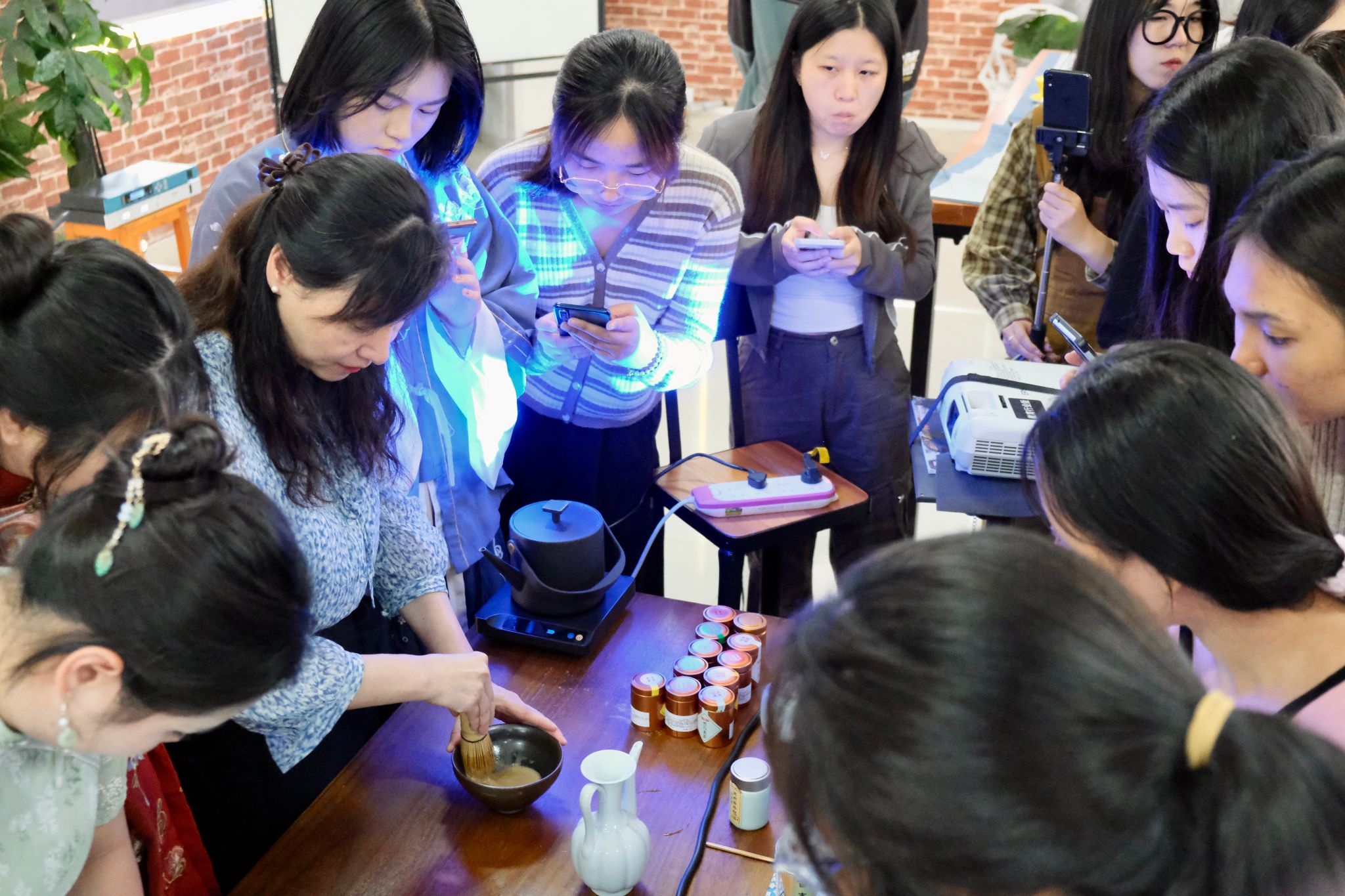 讲座伊始,刘晓芬以桌上摆放的古典茶具为切入点,引入中华茶文化的传播,并从品茗环境、茶叶辨析、泡茶要素、泡茶流程四个方面介绍了中华茶道源远流长的历史文化。她还现场展示了宋代点茶的“碾茶、热盏、击拂、水痕”的流程,将美轮美奂的汤花之美,古朴典雅的茶器之美,优雅至极的点茶手法,以及茶韵精神之美一一展现。