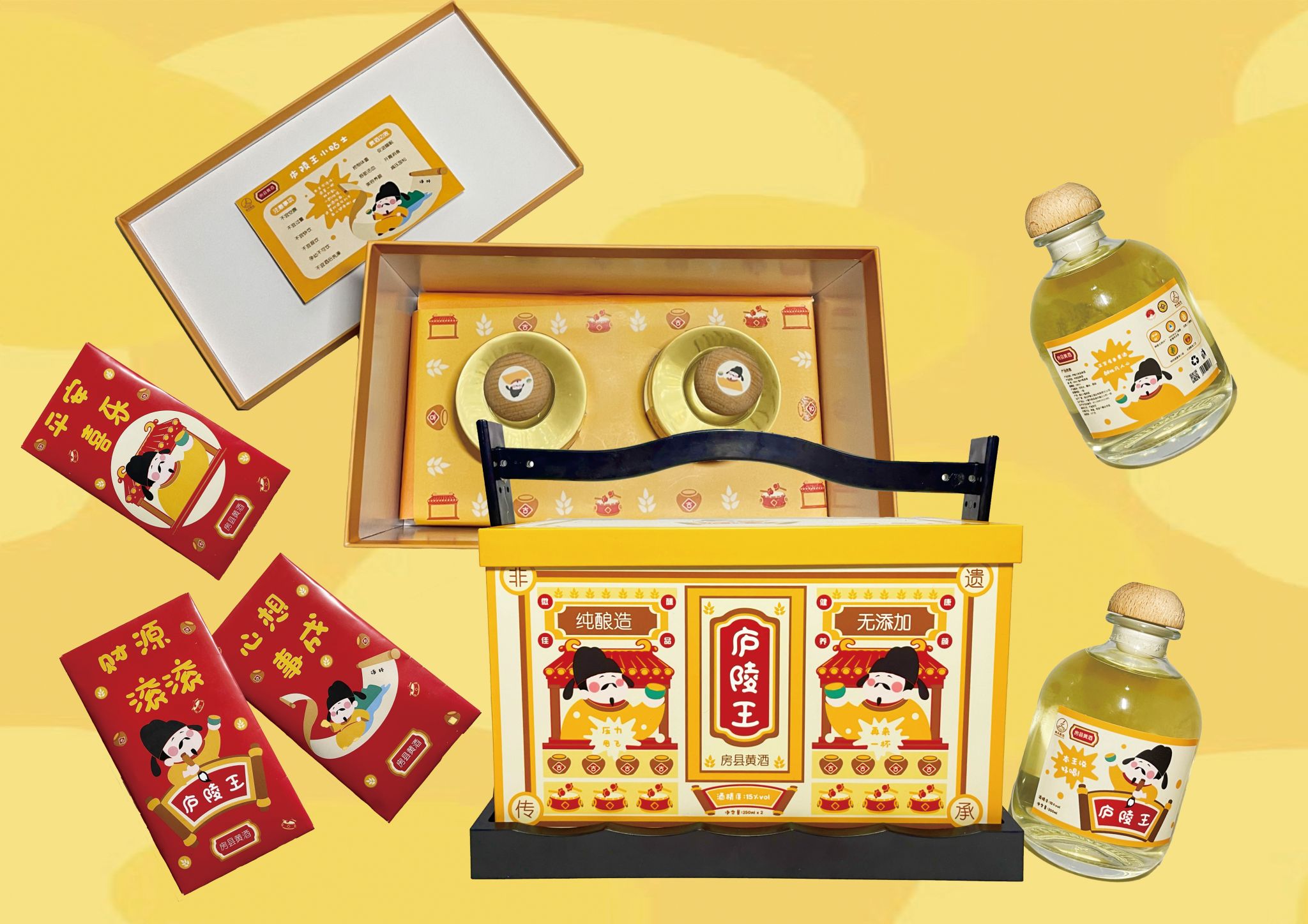 视传1212班严婷婷设计作品《庐陵王》结合湖北房县黄酒的历史背景与房县的人文地理环境,为包装设计了庐陵王的IP形象。包装提取了房县特色锣鼓、显对殿,优质水稻、古法制酒、非遗制酒工艺等元素,整体色彩明亮。包装字体圆润可爱,搭配可爱的文案,为房县黄酒打造年轻化定位,以扩大年轻市场。目前此包装已被武汉归园乡游信息科技有限公司采用,后期将对接当地村户进行量产。
