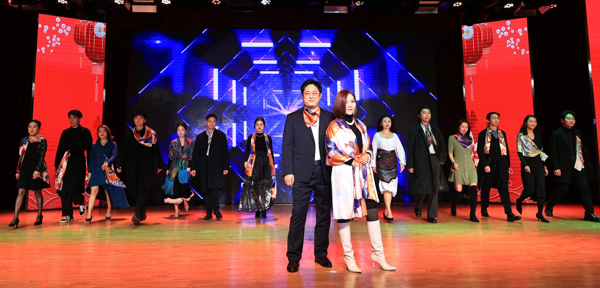 各学院分工会教职工身着彩色丝巾配饰,或系于颈上,或捏至指尖,或盘在腰间……步伐轻盈、风姿绰绰,走向舞台中央,开启走秀节目《民族丝巾秀》。秀场韵味十足,为在场的观众带来一场视觉盛宴。教师身着丝巾源于我校文化创意产品,由艺术设计与传媒学院学生参与设计与创作。