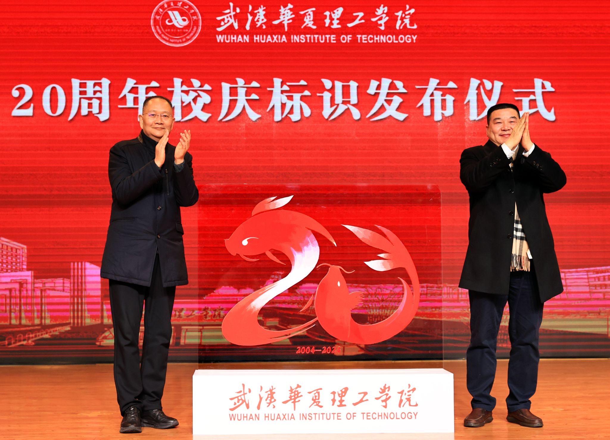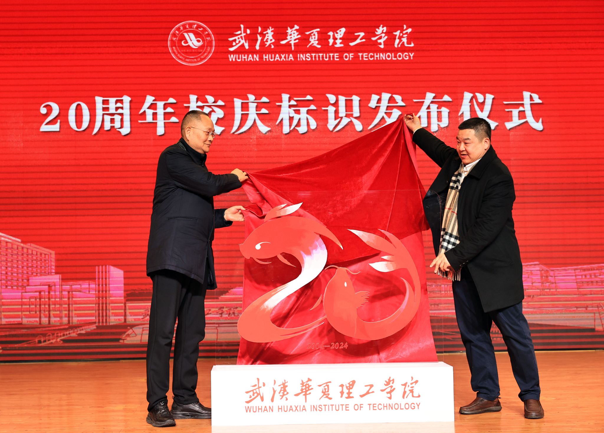 大会同步发布了学校建校20周年校庆标识。在全场观众的见证下,校长吴永桥、党委书记丁德智共同揭晓20周年校庆标识。