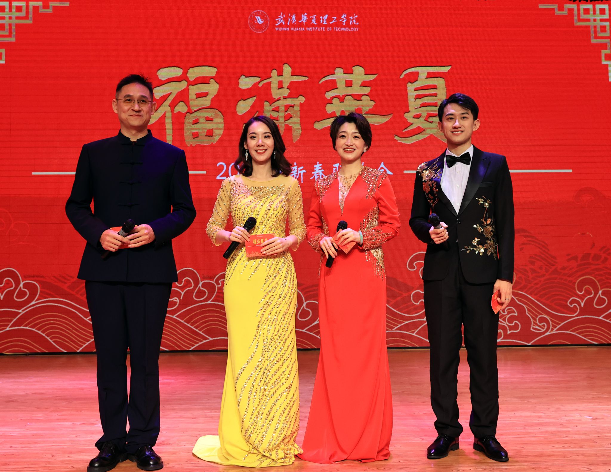 晚会中还有集法语、西班牙语、日语、粤语于一体的串烧歌曲《外文歌曲串烧》,华夏二代萌娃们共同演奏的器乐组合《我们多么幸福》,三代华夏教师倾情演绎的诗歌朗诵《我以我心》,各学院院长和书记登台献上的送祝福节目《福满华夏》等,形式多样、精彩纷呈,台下观众掌声连连、欢声笑语不断。