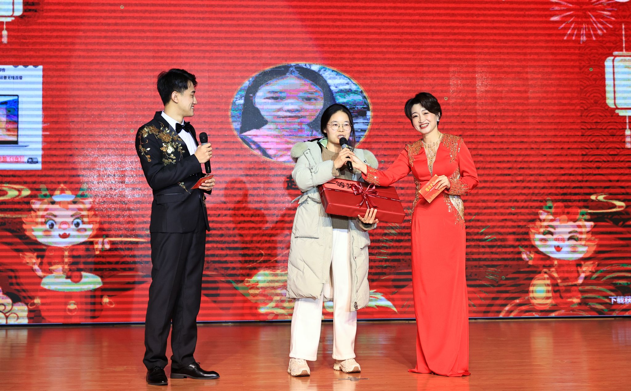 节目表演过程中,还穿插着三轮激动人心的抽奖环节。由大屏幕滚动所有教职员工照片,电脑分几轮随机抽取了200个幸运奖,50个三等奖,10个二等奖,1个一等奖,共送出华为笔记本、小米手表、苏泊尔空气炸锅、小米保温杯等丰厚奖品。抽奖现场高潮迭起,惊喜不断,欢呼连连。