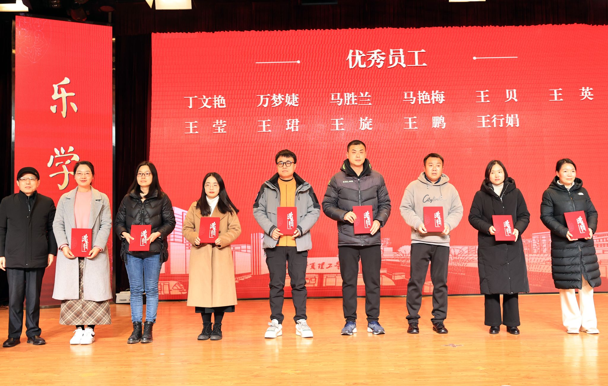 党委书记丁德智宣读《关于表彰2023年度优秀单位及优秀员工的决定》。大会颁发了“优秀员工”“优秀干部”“优秀单位”等奖项,校领导为获奖单位和个人颁发证书。