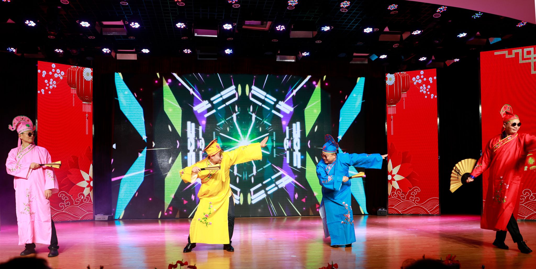 当憨态可拘的男教师们化身“四大才子”,头戴帽饰墨镜、手握团扇,粉墨登场,全场观众惊呼。来自各学院合编舞蹈《乘风破浪的哥哥们》,将晚会气氛逐渐推向高潮。伴随着服装变换,“男团哥哥”再次登场,一首动感舞曲后,字幅“华夏才子,掌声响起”缓缓打出,台下霎时间掌声一片。