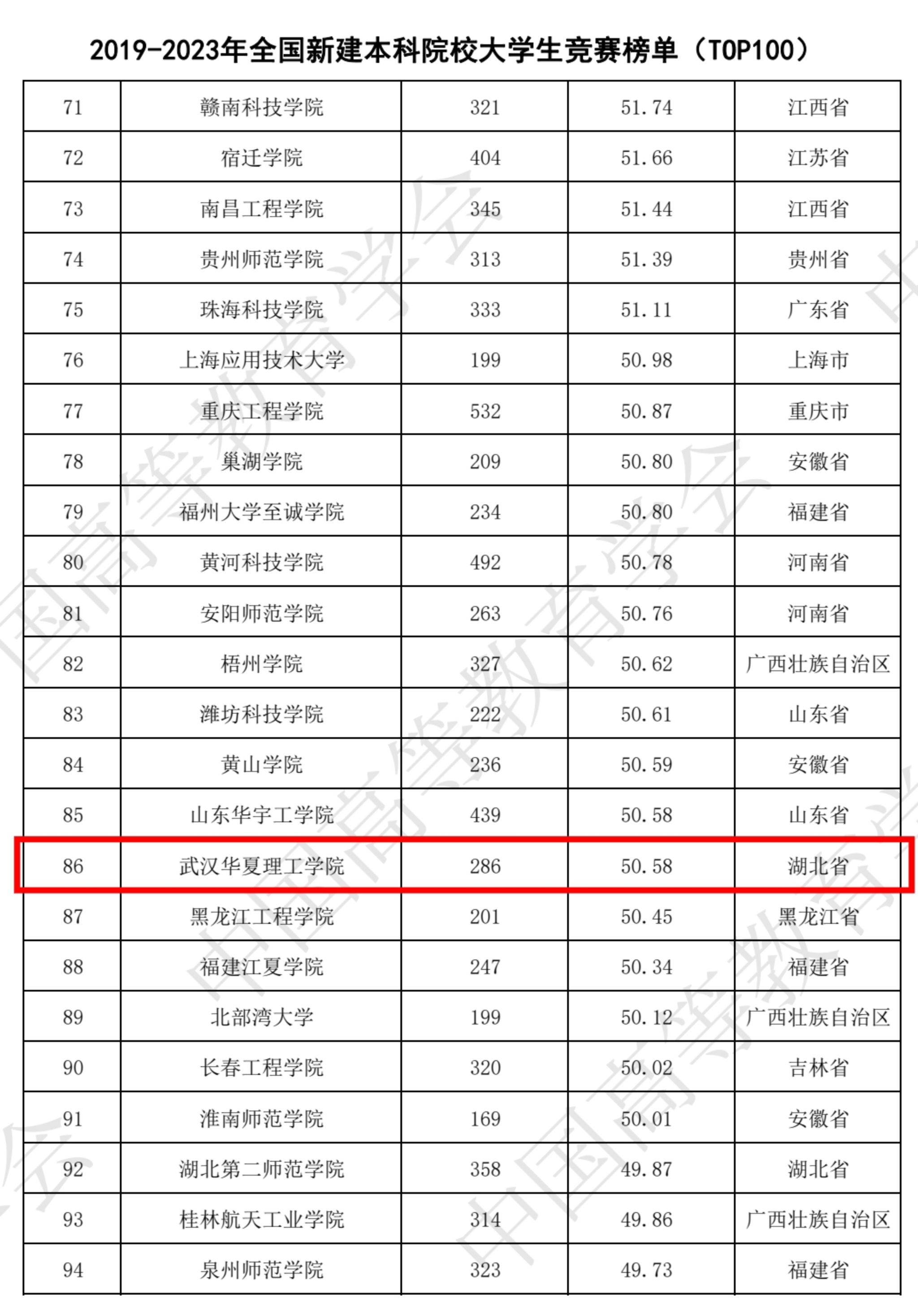3月22日,中国高等教育学会高校竞赛评估与管理体系研究专家工作组发布《2023全国普通高校大学生竞赛分析报告》,我校在2019-2023年全国新建本科院校大学生竞赛榜单(TOP100)中位列86位,较去年同期上升4位,是湖北省唯一入选的民办高校。