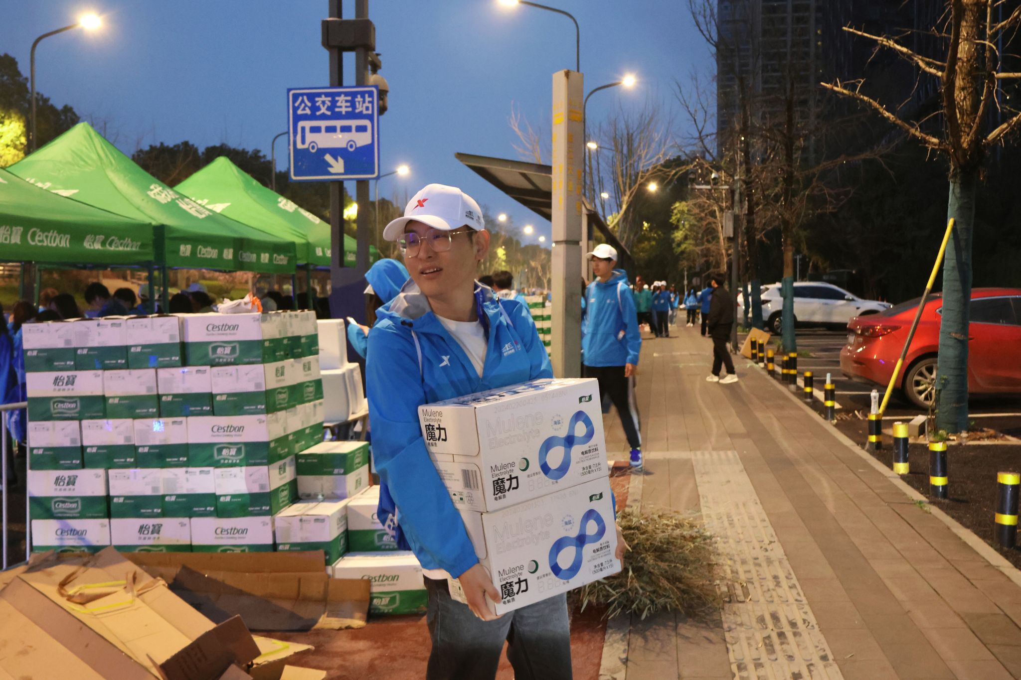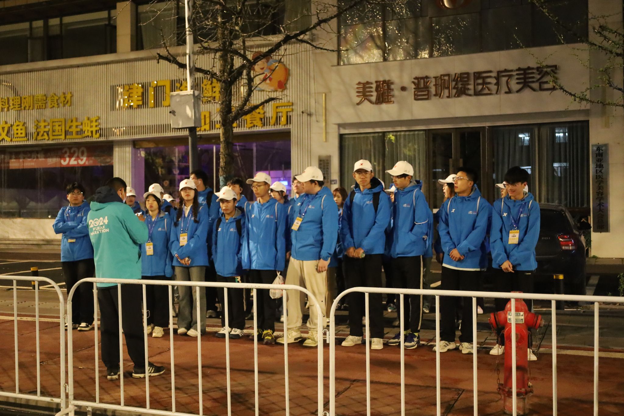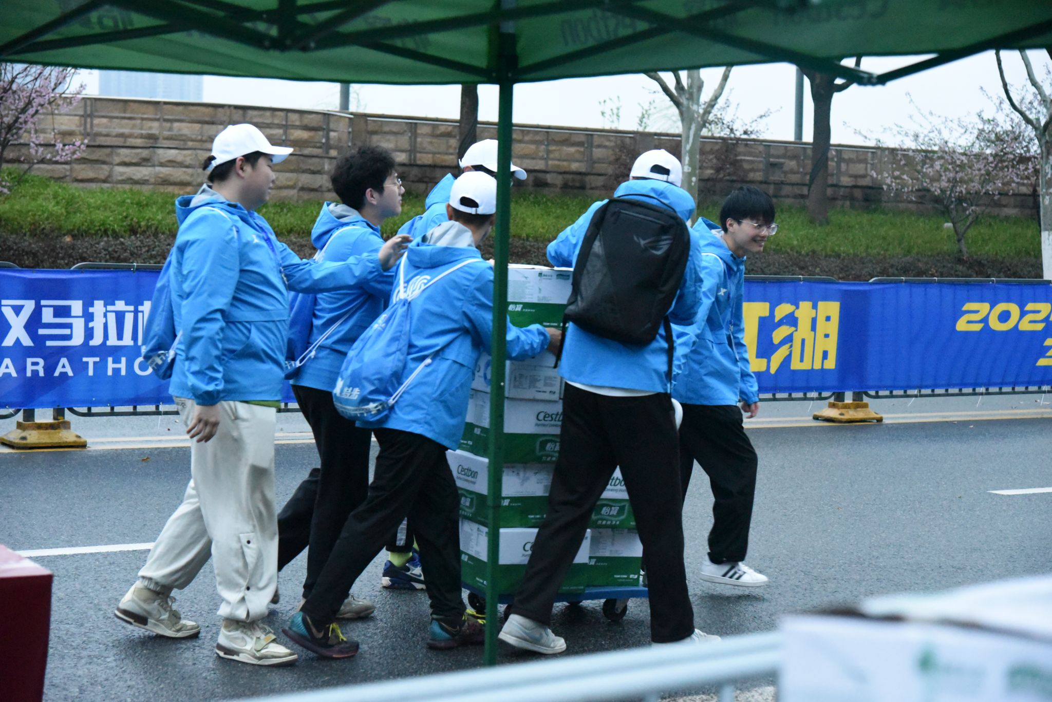 比赛当天,清晨4时30分,志愿者们就已集结完毕,准时从学校乘车出发前往目的地临江大道。顺利抵达后,志愿者们在各负责人的组织下重新分组。大家分工明确,配合默契,搬水、拿工具、铺桌布……各项工作有条不紊。