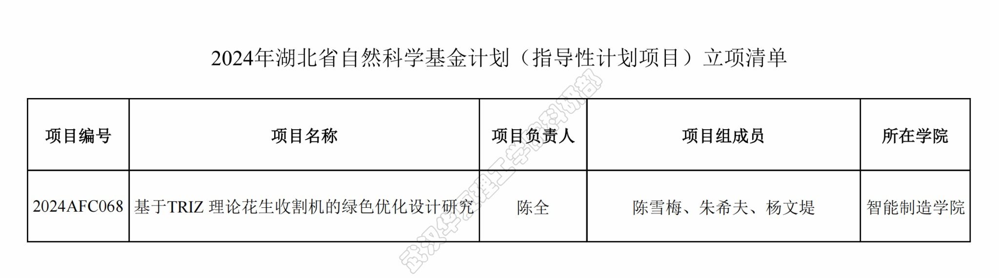 近日,湖北省科技厅发布了《省科技厅关于下达2024年省自然科学基金计划项目的通知》,我校智能制造学院教师陈全申报的课题《基于TRIZ理论花生收割机的绿色优化设计研究》获批指导性计划项目立项。