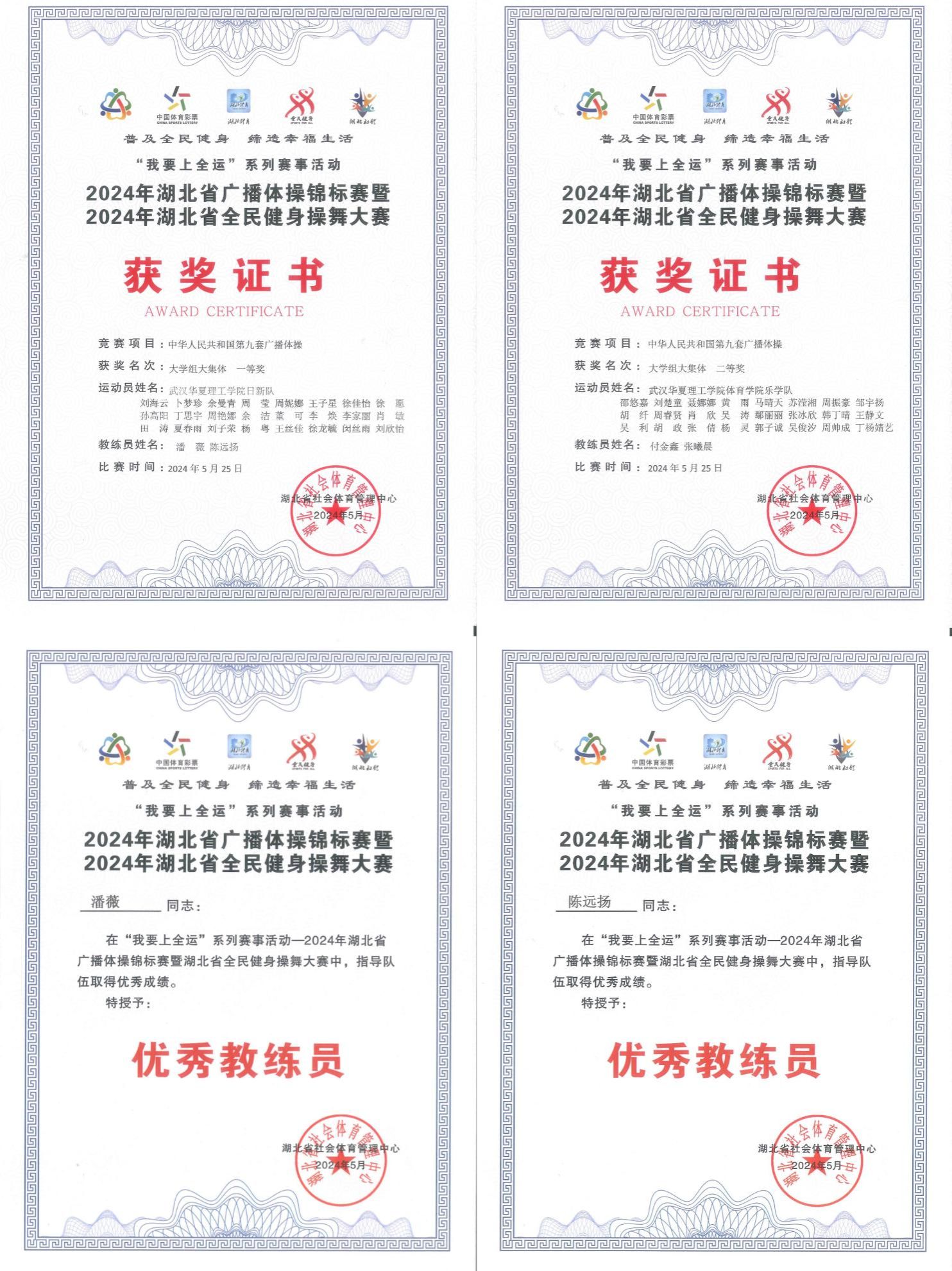 比赛现场气氛热烈,各参赛队伍都展现出了高超的技艺和饱满的精神状态。经过一番激烈角逐,我校日新队凭借出色的表现成功斩获中华人民共和国第九套广播体操比赛大学组大集体一等奖,乐学队荣获二等奖。我校教练员潘薇、陈远扬老师获得“优秀教练员”荣誉称号。