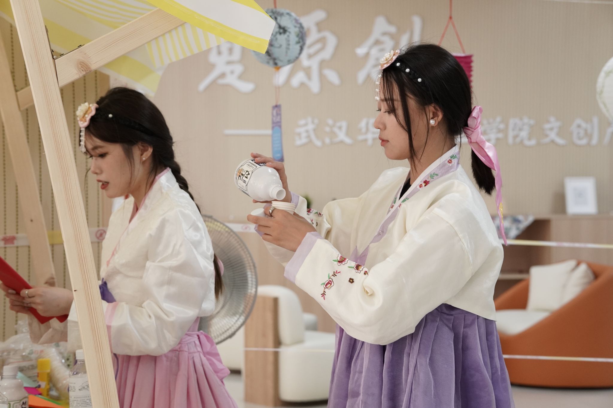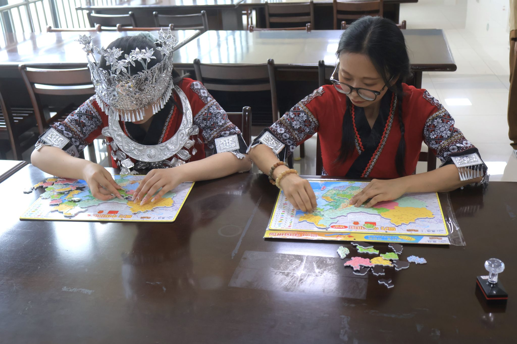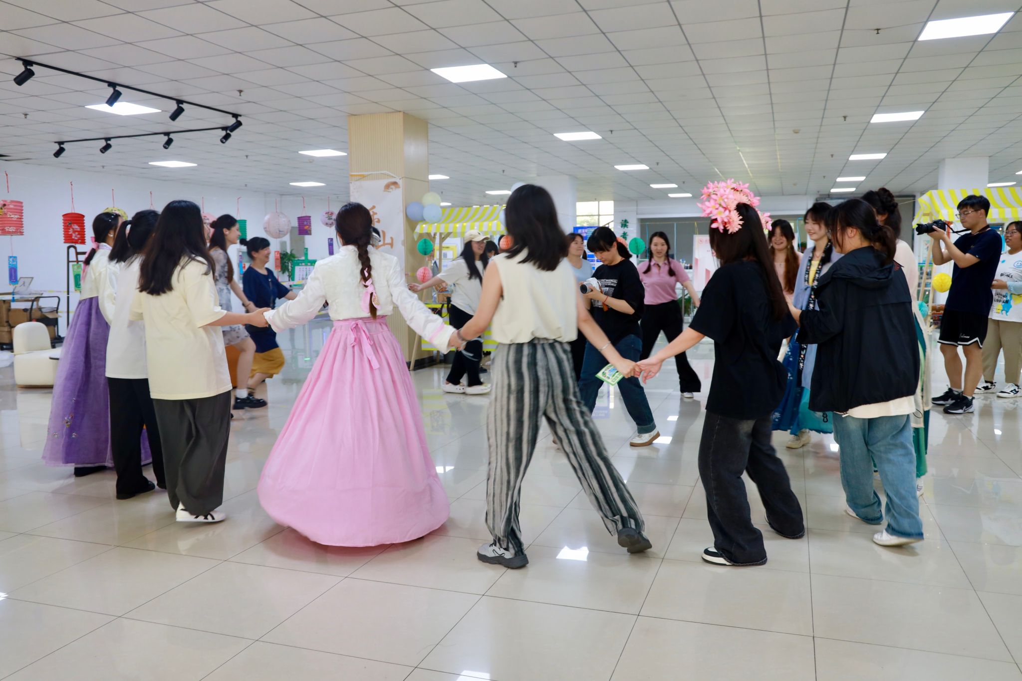 本次“书香之旅”活动是我校读书月系列活动之一,活动面向全校师生,通过打卡集章的方式展开。和蟳埔女一同簪花,学朝鲜语、打卡北国风光,品尝甜皮鸭、感受彝族服饰的特色,喝酥油茶、感受藏族舞蹈的魅力……一楼设置了泉州、延吉、乐山、拉萨四个地图,闯关者在入口处通过摇骰子决定去向。除了各具特色的民俗文化体验,现场还设置了“盗匪”NPC抢卡,以及民族服饰舞蹈快闪等趣味环节。