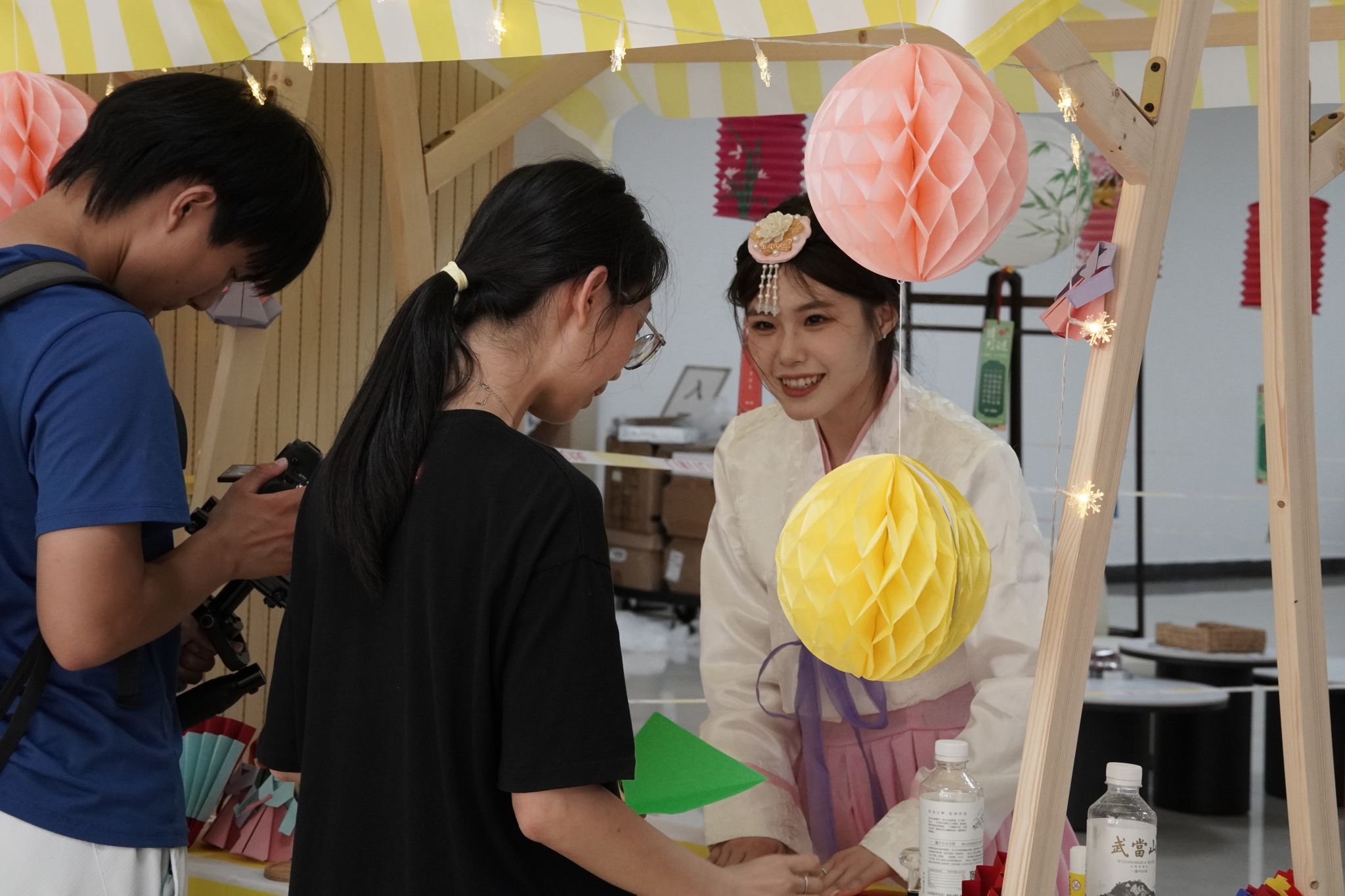 与一楼偏体验的项目不同,二楼的闯关充满了挑战和童趣。投壶、捶丸、抽陀螺,既考验闯关者的耐心,又考验力度的把控,现场不时激起喝彩声一片。顺利通过全部关卡的闯关者,可兑换校园民族写真、图书馆赠书券、精美钥匙扣、书签等丰厚奖品。