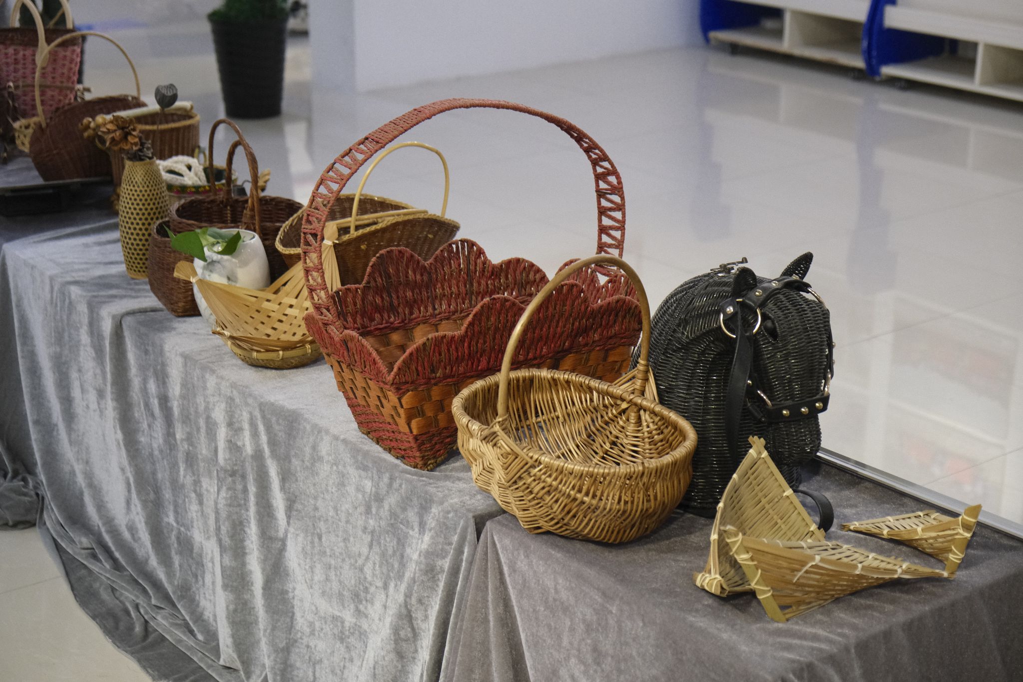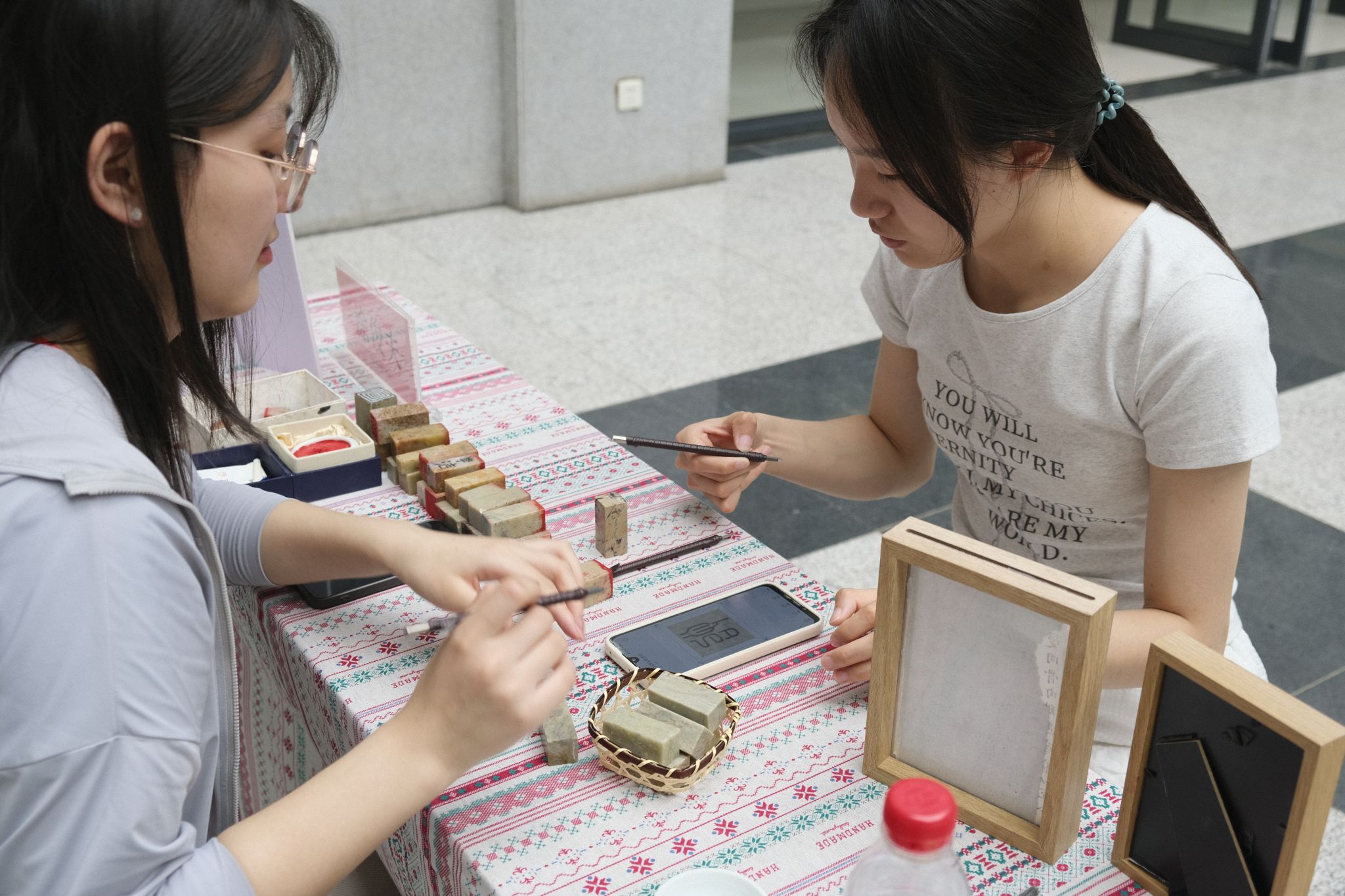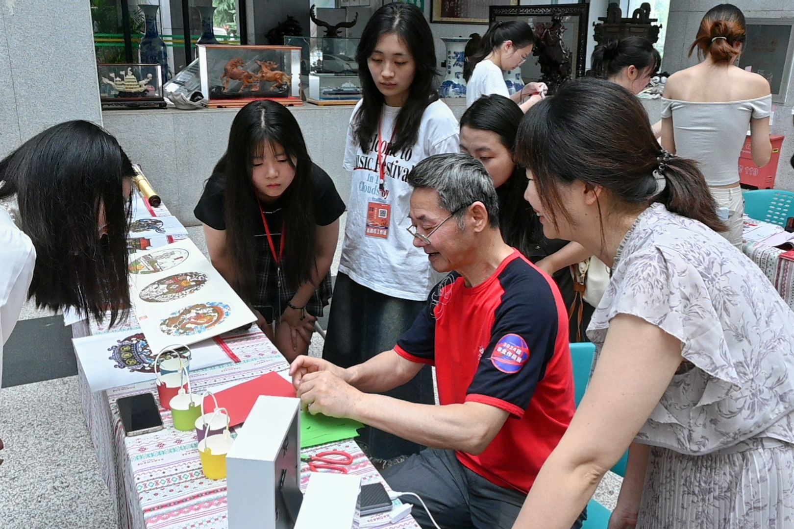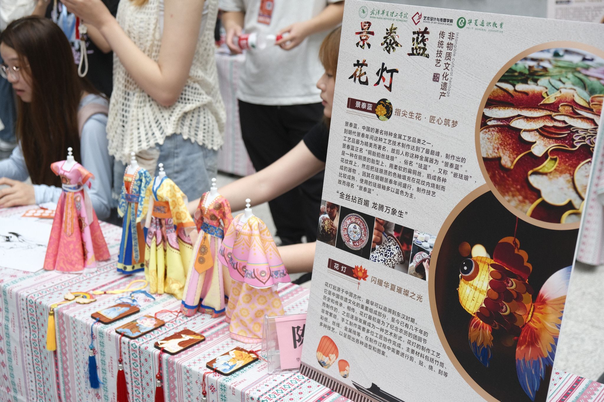 上午11点,“寻美华夏”非遗文化节正式拉开帷幕。翩翩起舞的飘漆画扇、描龙绣凤的汉绣、栩栩如生的剪纸、矫若惊龙的书法、匠心独具的芒编、精美绝伦的景泰蓝花灯、技巧独特的缠花衍纸……吸引了众多师生驻足。非遗传承人和志愿者在综合楼一楼大厅内进行非遗工艺展演,吸引众多师生前来体验打卡,在实践创作的过程中探寻传统文化的魅力,了解和领略非遗文化之美。
