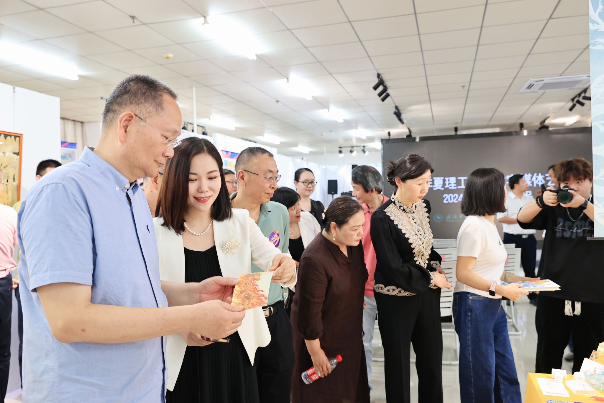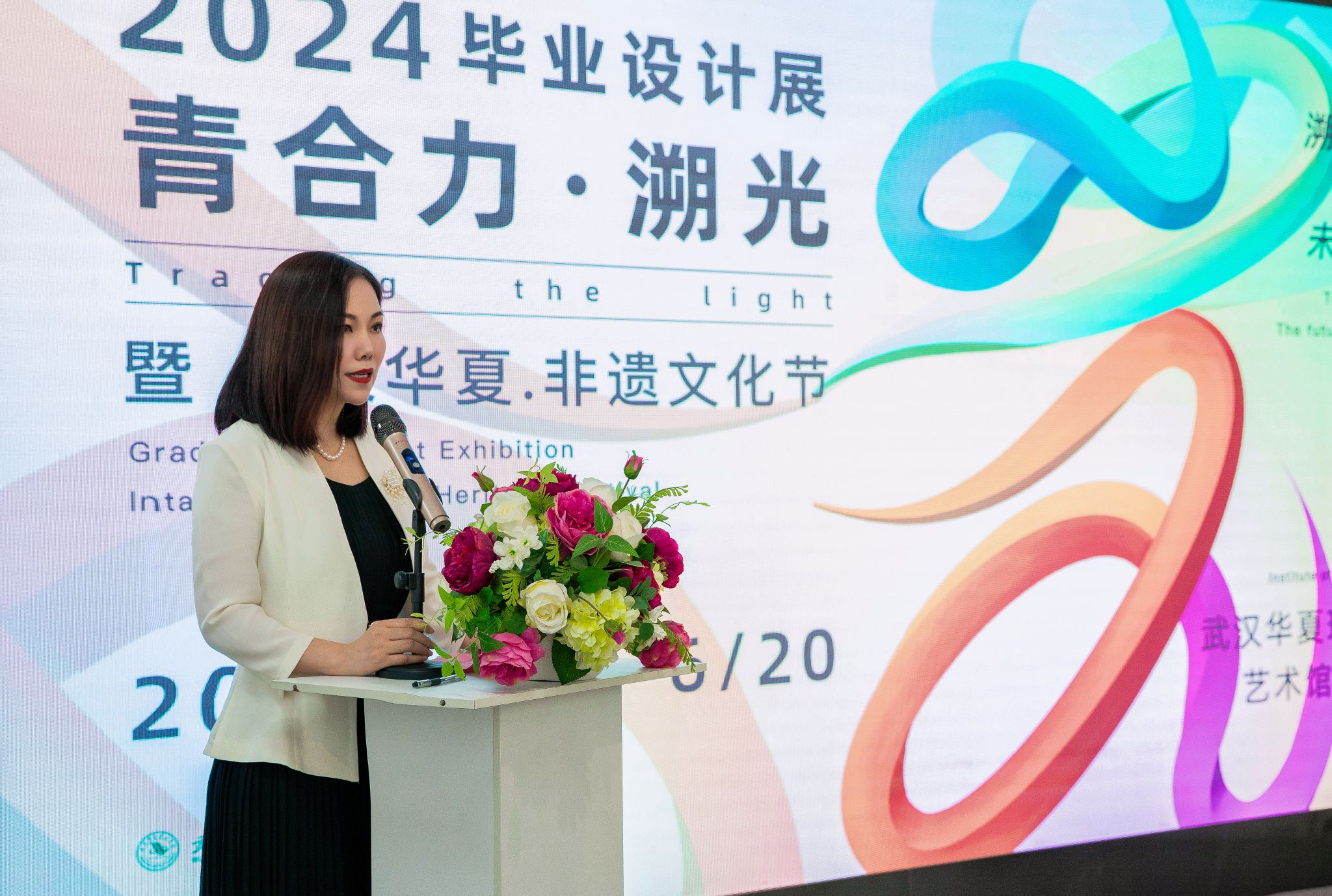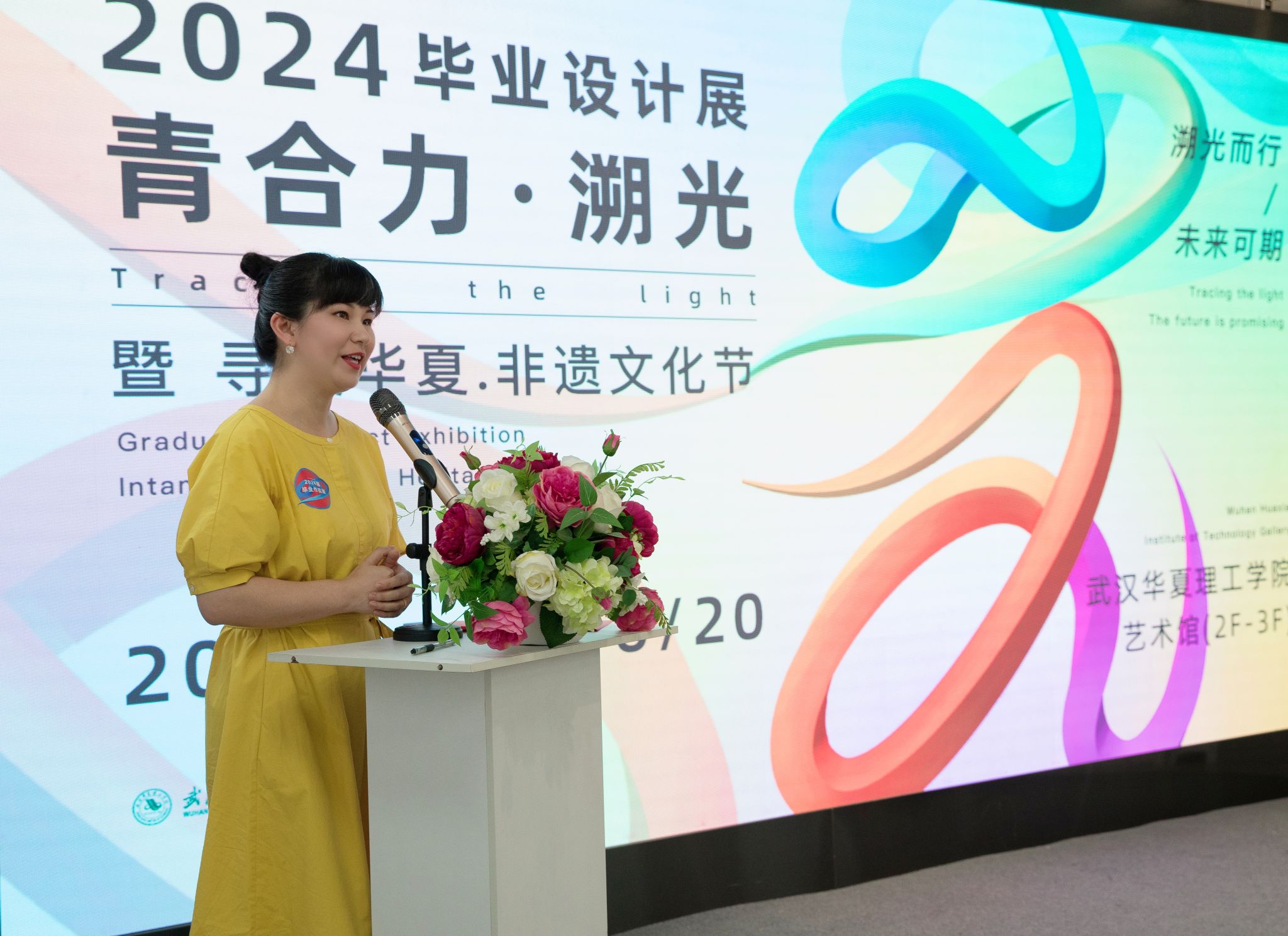 董事长张晓东,全体校领导,武汉市汉绣非遗传承人、湖北省工艺美术大师王燕,湖北省武汉剪纸非遗传承人、湖北省工艺美术大师沈松柏,黄冈市红安县八里湾镇八里湾社区党支部书记、主任向杰,湖北巷陌杨科技有限公司总经理杨扬,武汉荣博市政园林工程有限公司副总经理丁莉,武汉艺萌听力康复医院总经理王江虹,武汉艺萌康复教育事业部总监朱汉珍、总监助理肖莹、教研主任王海玲,学校各职能部门、学院负责人及艺术学院师生代表参加开幕式。活动由艺术设计与传媒学院副院长邓婧主持。