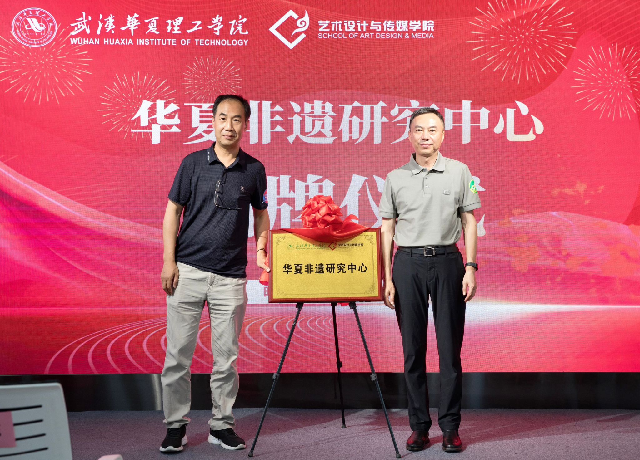 我校首届“寻美华夏”非遗文化节同时开幕。张晓东和艺术设计与传媒学院名誉院长路由共同为“华夏非遗研究中心” 揭牌。