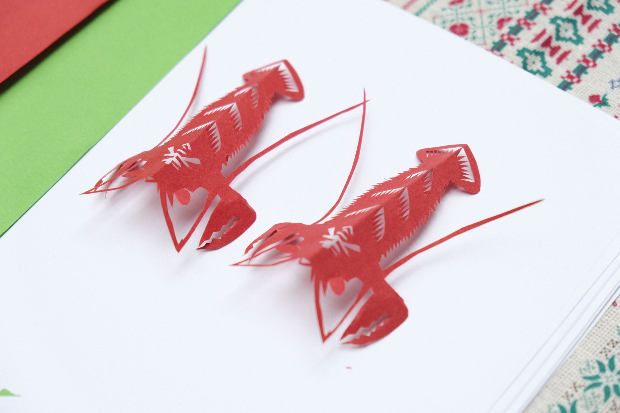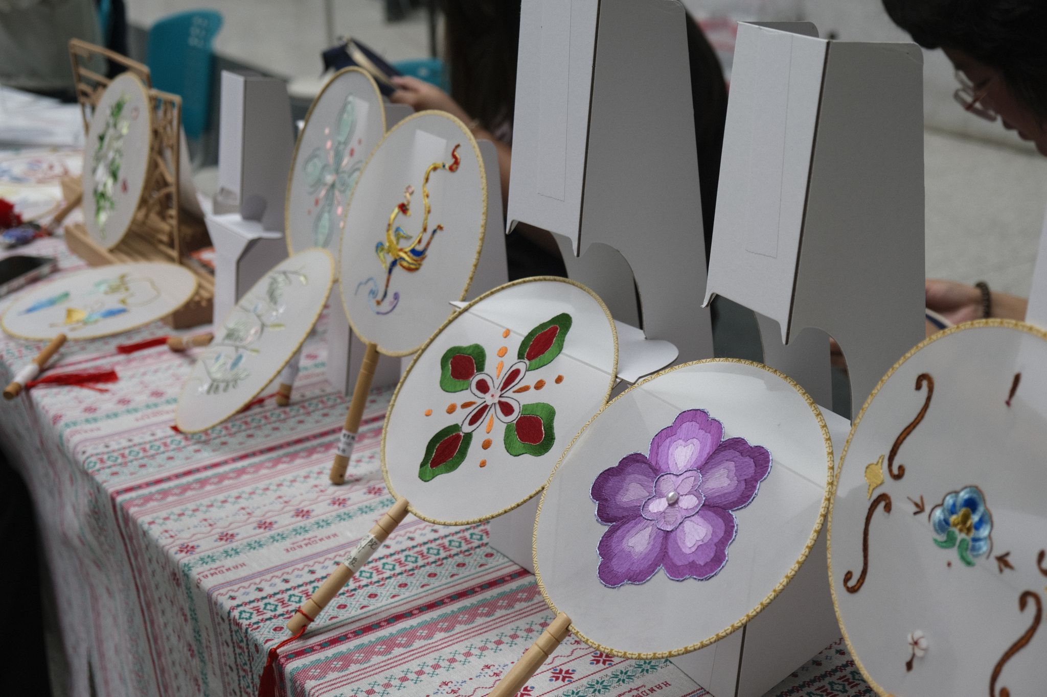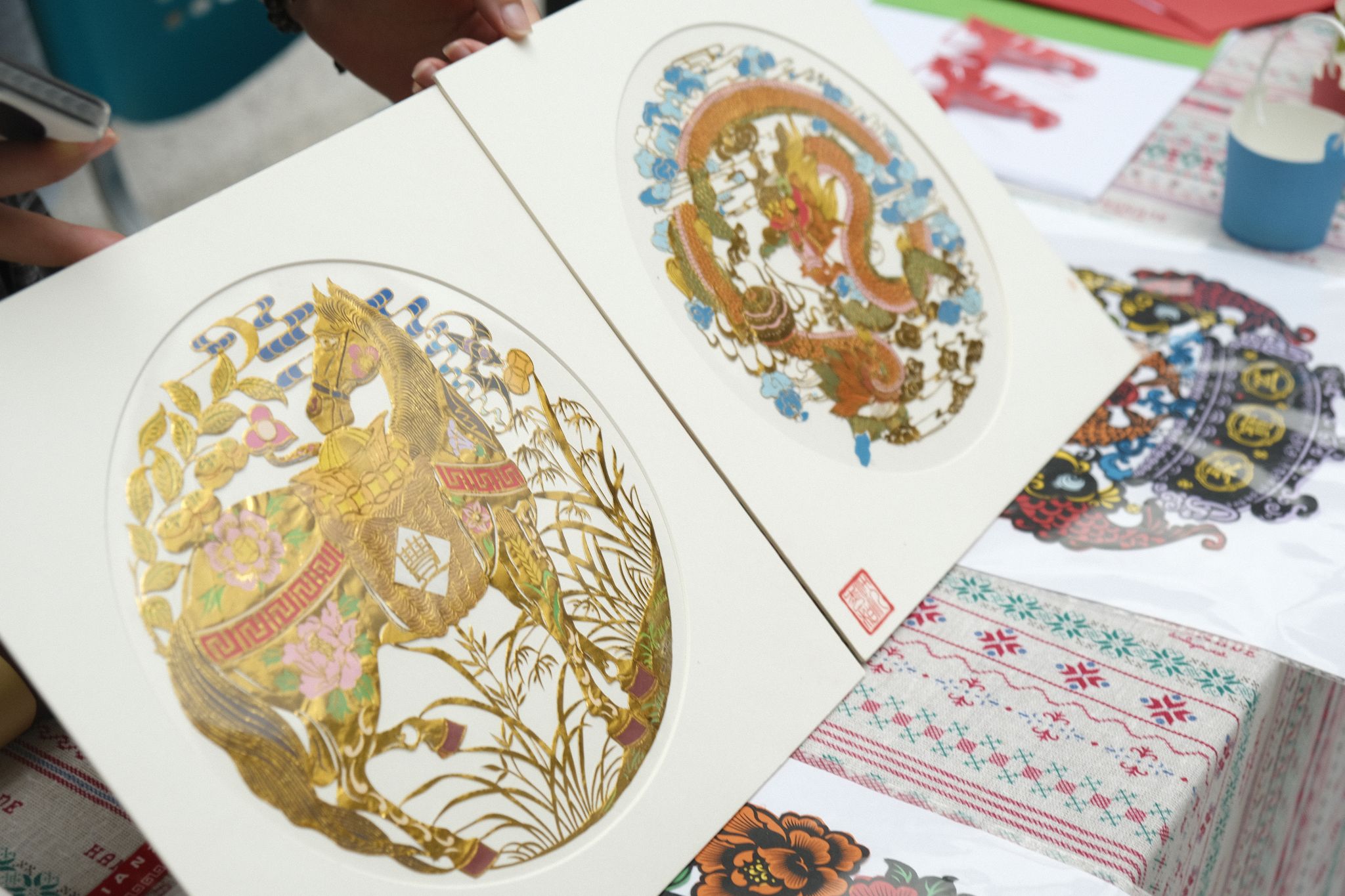 一把剪刀、一张红纸、一折一转、刀起刀落,只见两只活灵活现的小龙虾便出现在了沈松柏手中,围观者无不啧啧称奇。在汉绣展位前,王燕则现场展示了汉绣的制作过程,并详细讲解了传统图案的寓意以及针法技巧。在谈到汉绣的特色时,她详细阐述了其“重色重彩、分层破色、富丽堂皇、对比强烈”等艺术特点。她表示,汉绣不仅是一种艺术形式,更是一种文化的传承和表达。