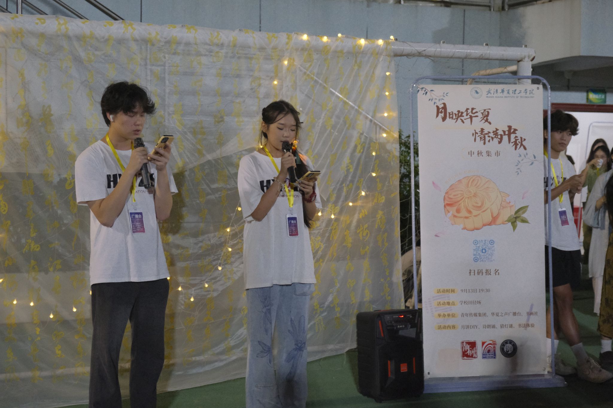 《月光下的中国》《中秋诗词散文串烧》……广播台的诗词朗诵系列节目,为这场中秋活动增添了几分意境与雅致。“君不见黄河之水天上来,奔流到海不复回……”由2023年“诵读经典,筑梦华夏”朗诵大赛决赛优秀奖获得者柳宇桐、沈业祥带来的获奖朗诵曲目《将进酒》,更是将现场的气氛推向高潮。激情澎湃、极具感染力的朗诵,诗词与中秋的完美结合,让在场的新生们纷纷折服于经典的魅力。