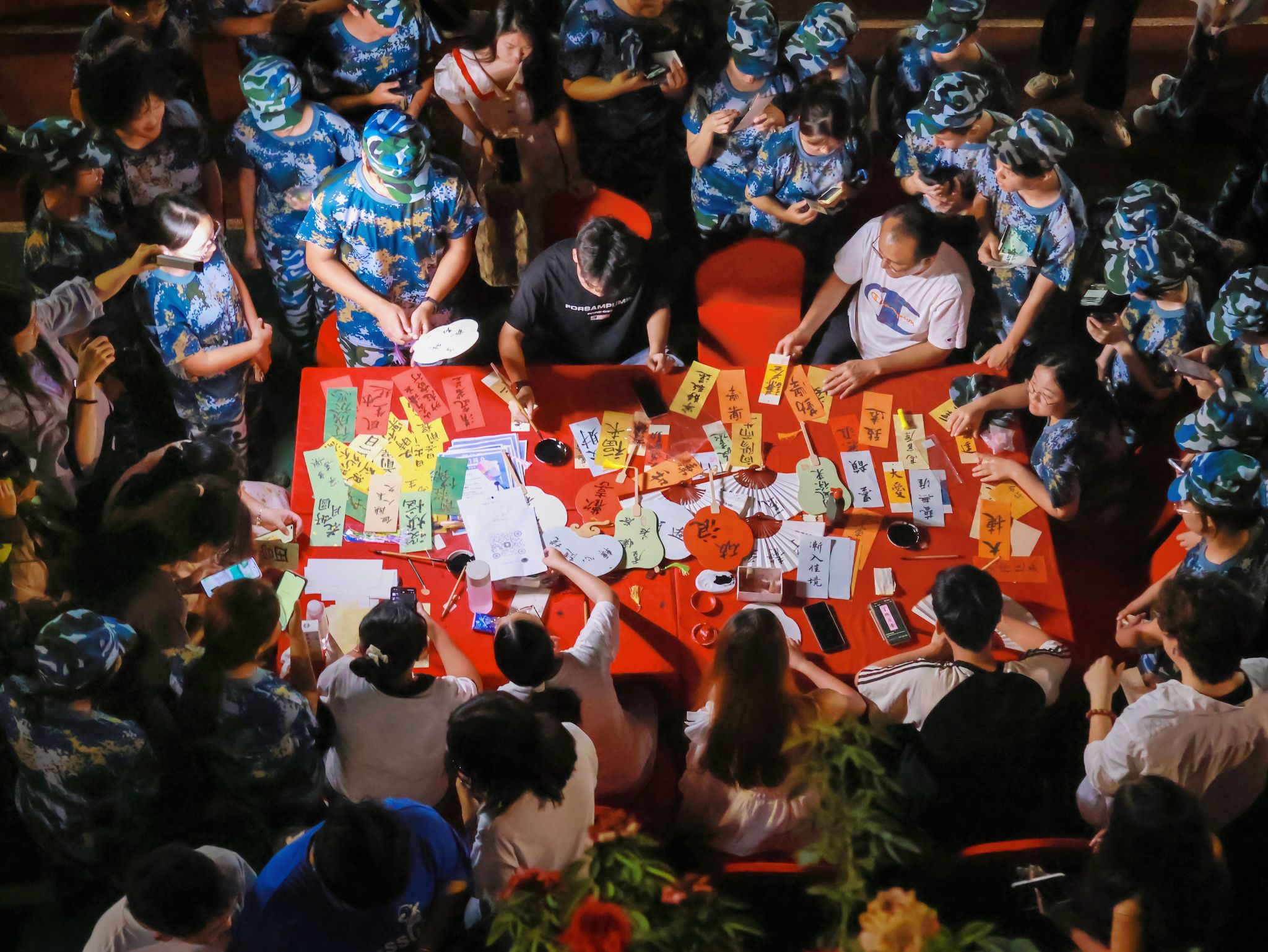 团扇书法体验区里,书法社的同学们应新生们的要求,忙碌地现场书写团扇、书签等,而另一边的新生们,则在大大方方地展示才艺。“明月几时有、把酒问青天……” 彩灯装饰的表演区内,新生们带来一首首耳熟能详、节日气氛浓烈的歌曲,吸引众多观众围观和应和,现场温馨而浪漫。