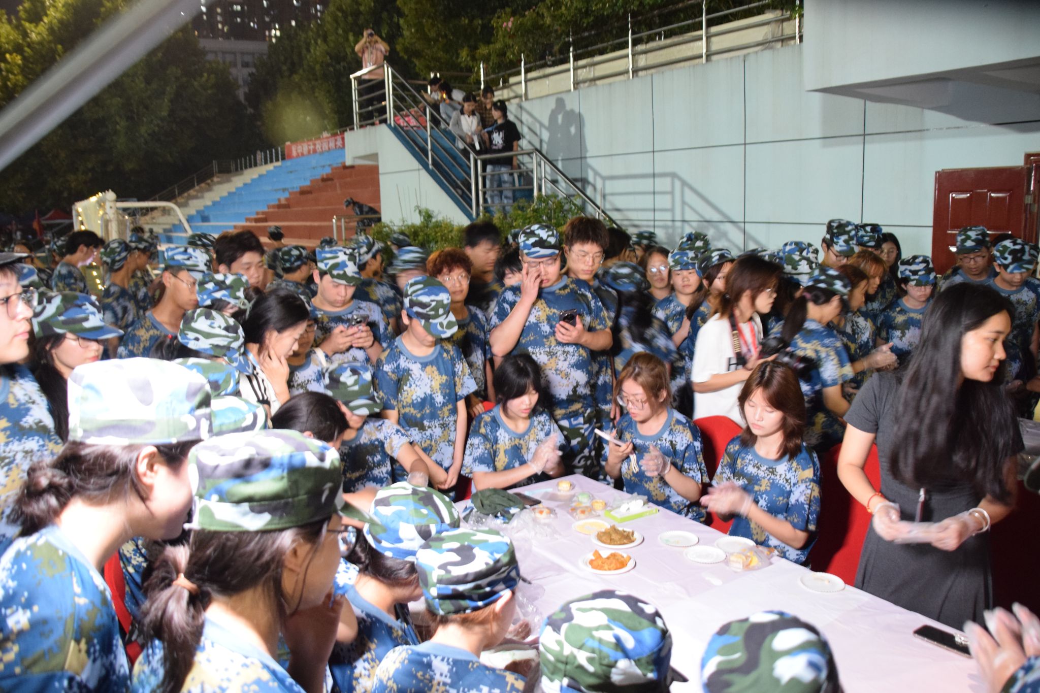 月饼DIY体验区,红色的桌椅一字排开,桌上提前铺好了工作人员准备好的即食冰皮月饼材料:彩色果蔬粉、多种口味馅料,提前揉搓好的免蒸免煮冰皮面团,以及60多种形状各异的月饼模具整齐摆放。8时许,刚下训的新生,在教官的指导下,分四批有序依次来到体验区。