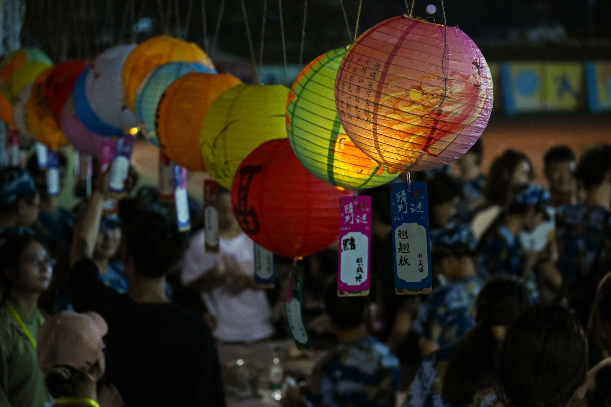 猜灯谜区,一排排彩色的中国风灯笼高悬展台,一个个妙趣横生的谜语镶嵌其中。“中秋别后重团圆” “元宵中元中秋”……谜底是什么?新生与好友激烈讨论着,时不时传出猜出谜底的欢呼声,现场热闹非凡。