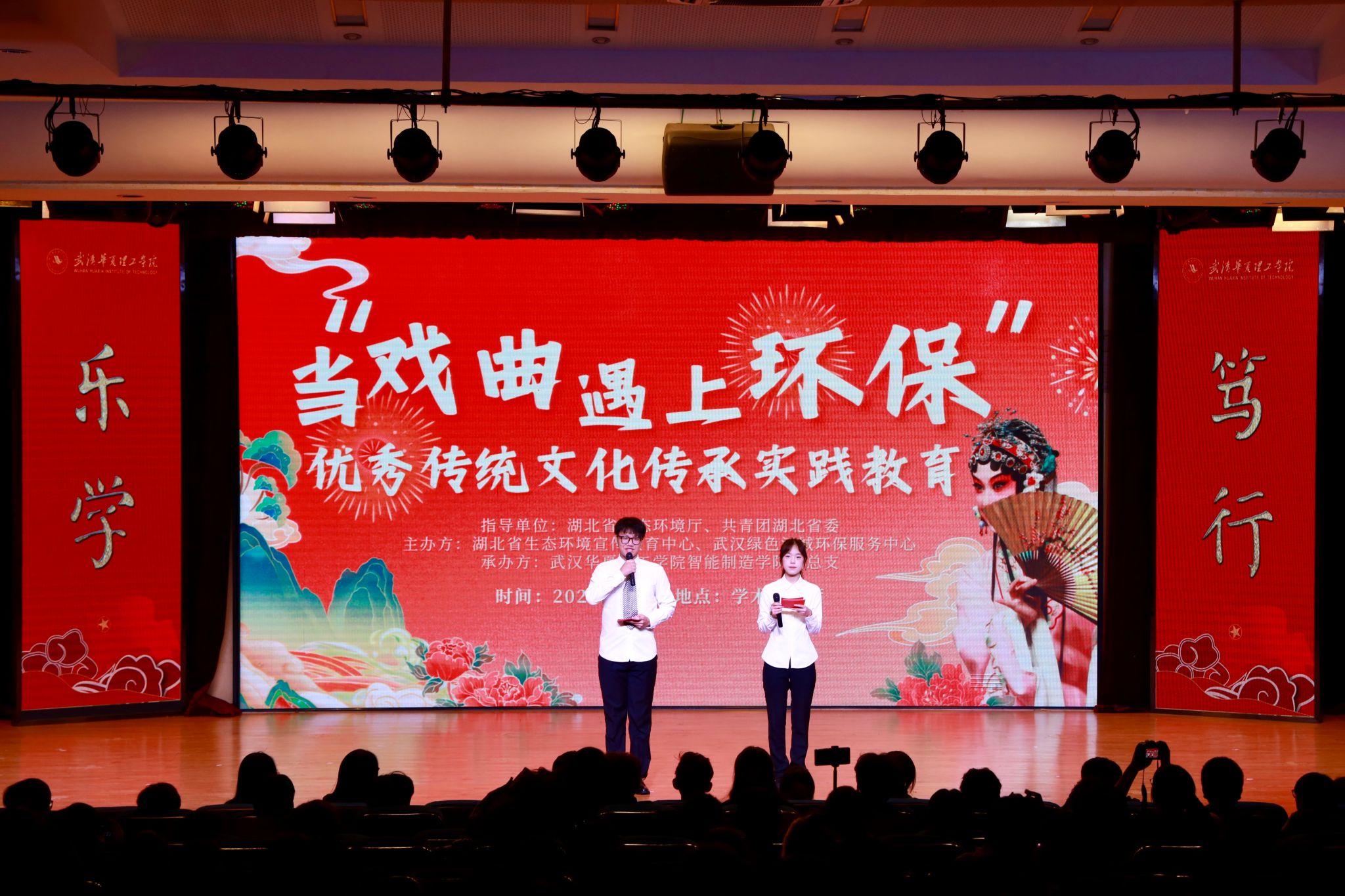 为弘扬“绿水青山就是金山银山”的环保理念,动员引导广大青少年在全面推进美丽中国建设中挺膺担当, 10月26日晚,一场别开生面的优秀传统文化实践教育活动“当戏曲遇上环保”在综合楼学术报告厅火热开展。活动将戏曲与环保巧妙融合,用戏曲和话剧的方式传达出环保理念。武汉市生态环境宣教中心代表刘婷婷,校团委书记潘晶,智能制造学院学工办主任向胜涛与现场600余名师生共享视听盛宴。
