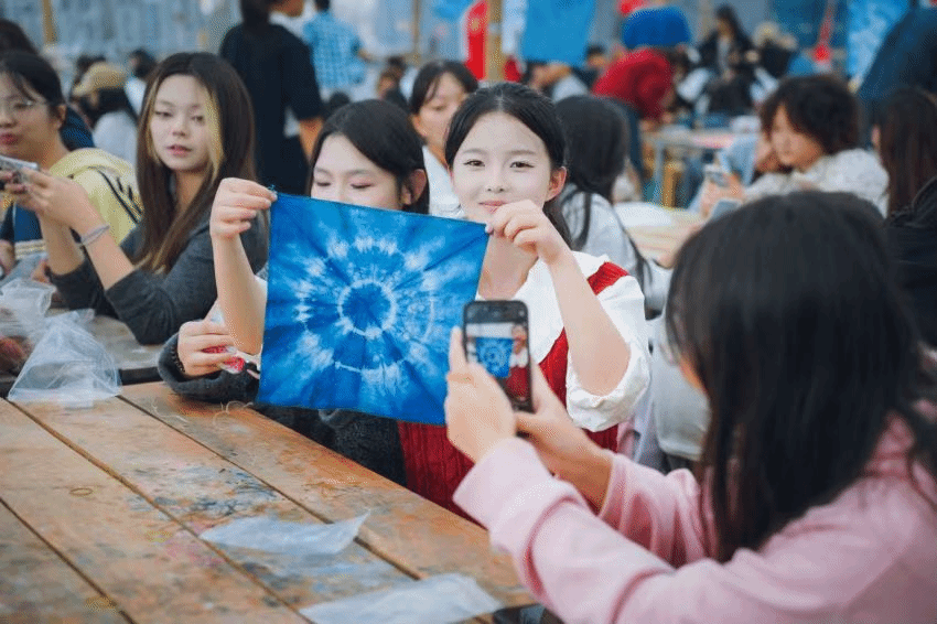 草木扎染技艺体验区的学生们则在老师的指导下,学习基本的扎结和染色技巧,亲手制作出独一无二的手帕作品,沉浸式感受非遗文化的魅力。
