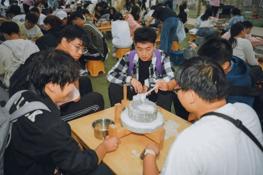 用小石磨研磨黄豆,将流出的浆液倒进锅里煮开,再通过细密的纱布过滤,将豆渣与豆浆分离……在古法豆腐制作环节,学生们在老师的带领下,一步步认真操作,品尝亲手制作的香醇豆浆,体验劳动的成就感与快乐。老师还现场教同学们点卤,共同感受豆浆变豆花的神奇过程。