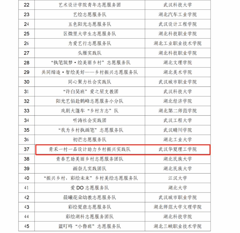 其中“青禾一村一品设计助力乡村振兴实践队”入选2024 年湖北省“青春手绘•美丽乡村”艺术助力乡村振兴志愿服务项目拟通报表扬团队名单,“沐光社会实践队”入选2024年湖北省“七彩假期”志愿服务项目拟通报表扬团队名单。
