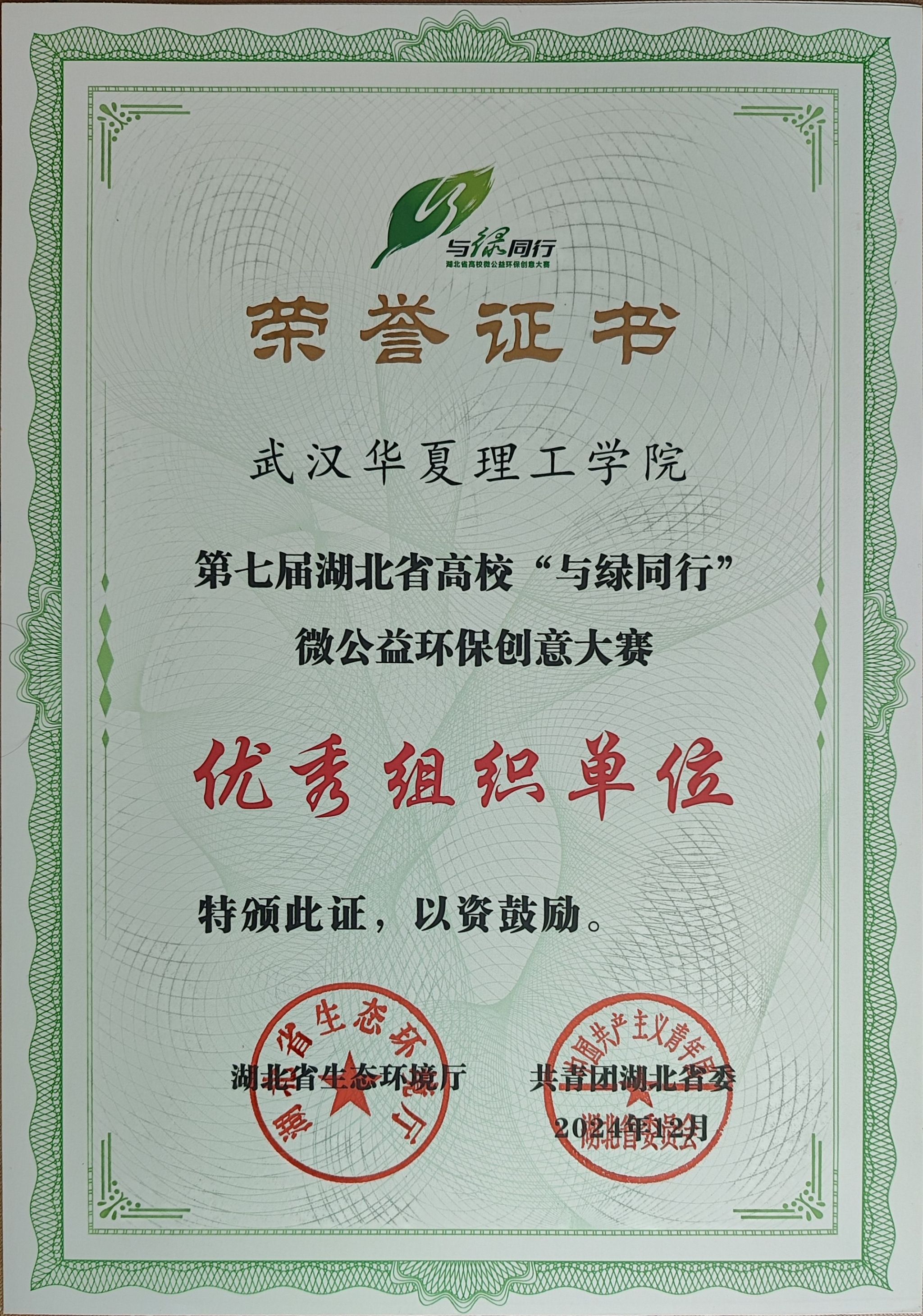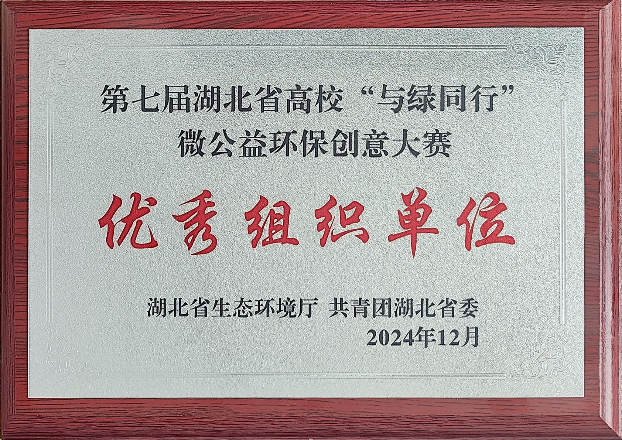近日,湖北省生态环境厅公布第七届“与绿同行”微公益环保创意大赛评选结果,我校荣获“优秀组织单位”称号。