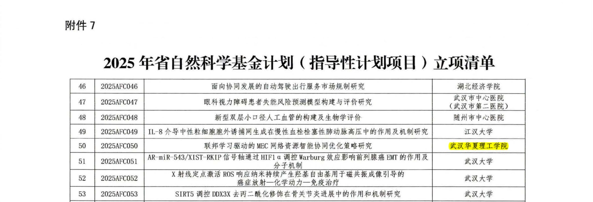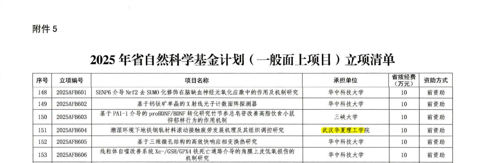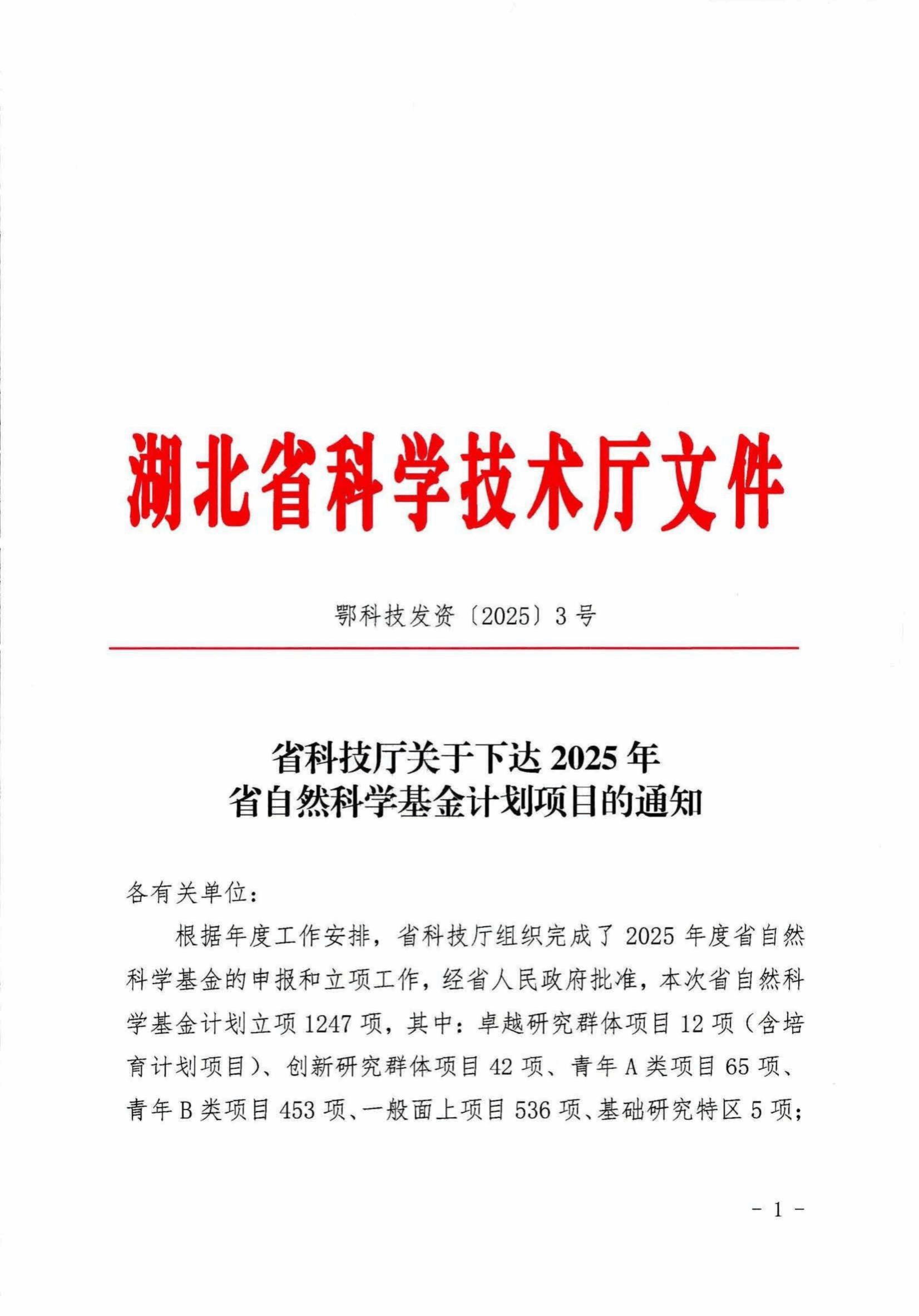 近日,湖北省科技厅发布《省科技厅关于下达2025年省自然科学基金计划项目的通知》,我校智能制造学院费俊杰老师、信息工程学院马艳梅老师申报的课题分别获批2025年湖北省自然科学基金一般面上项目和指导性计划项目立项。