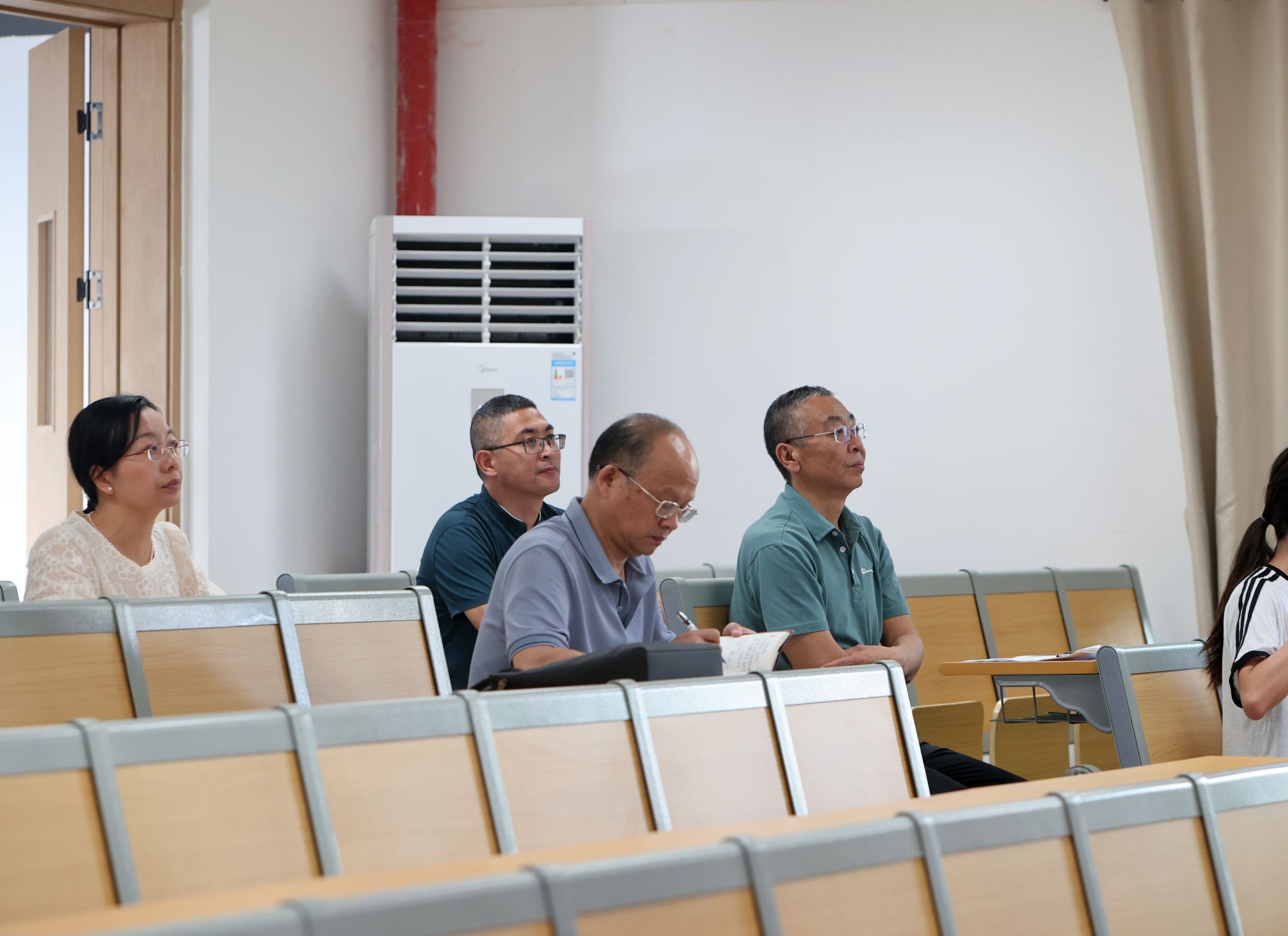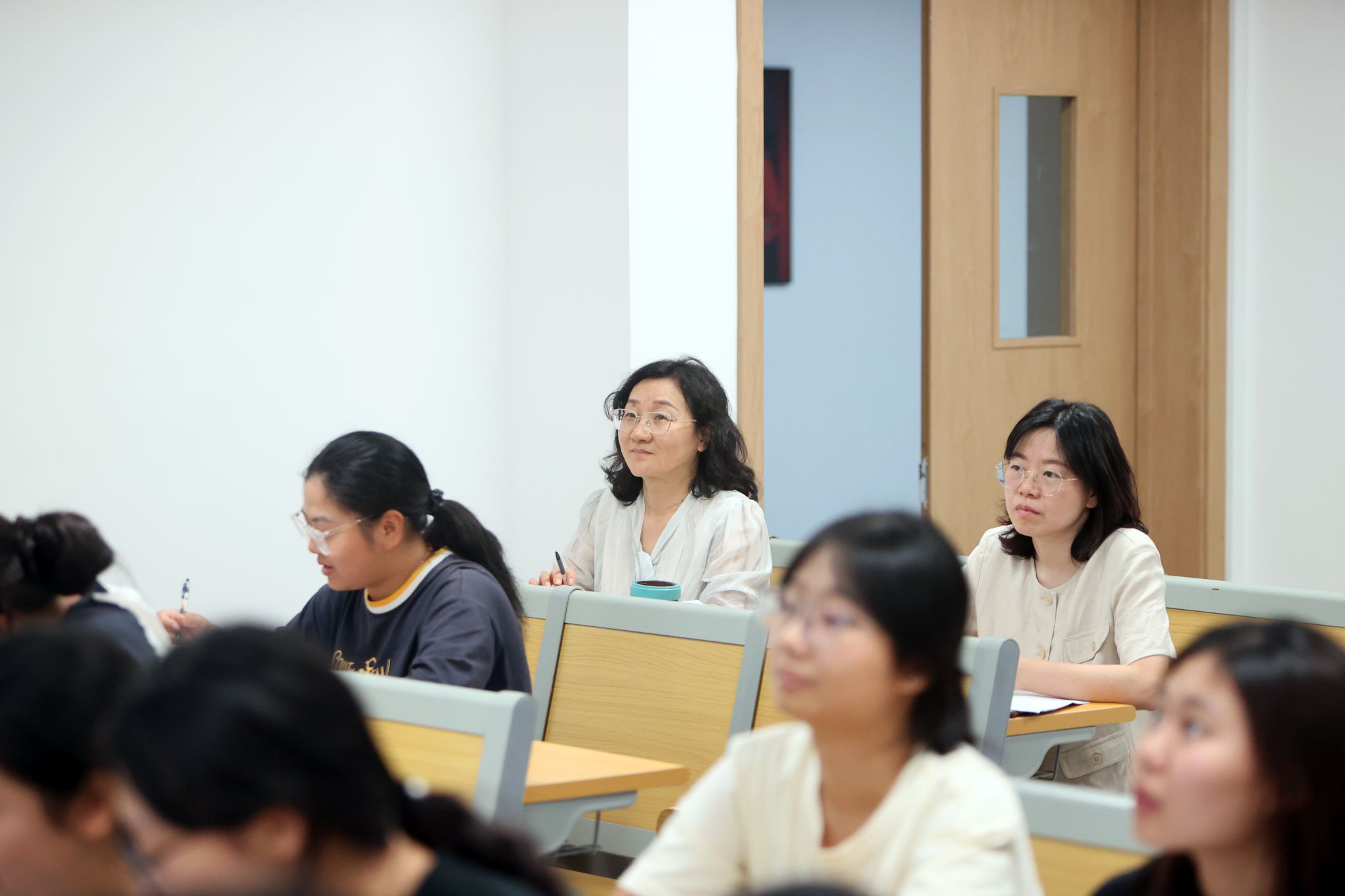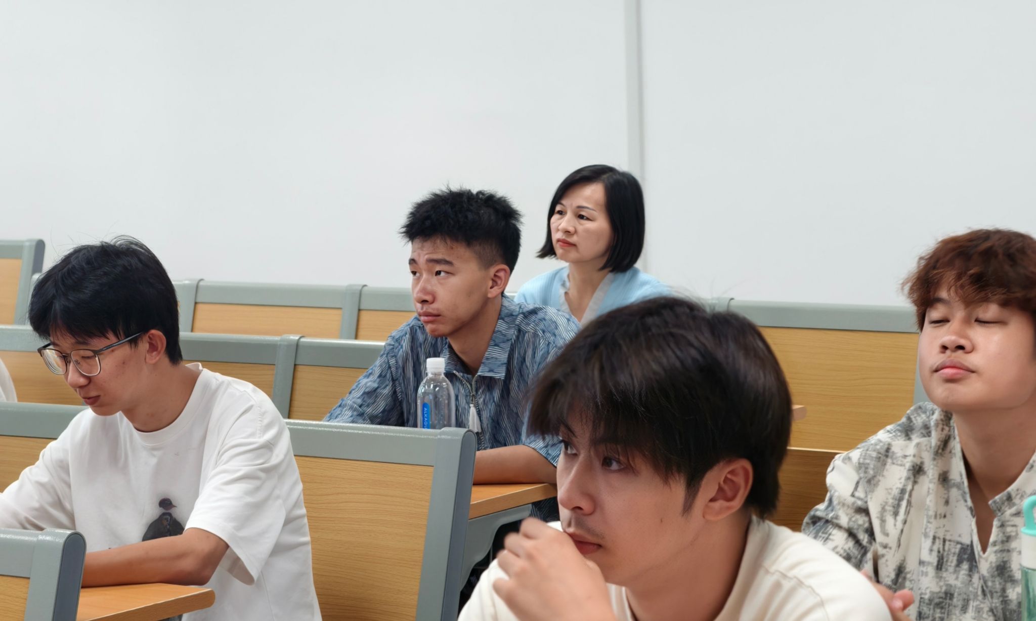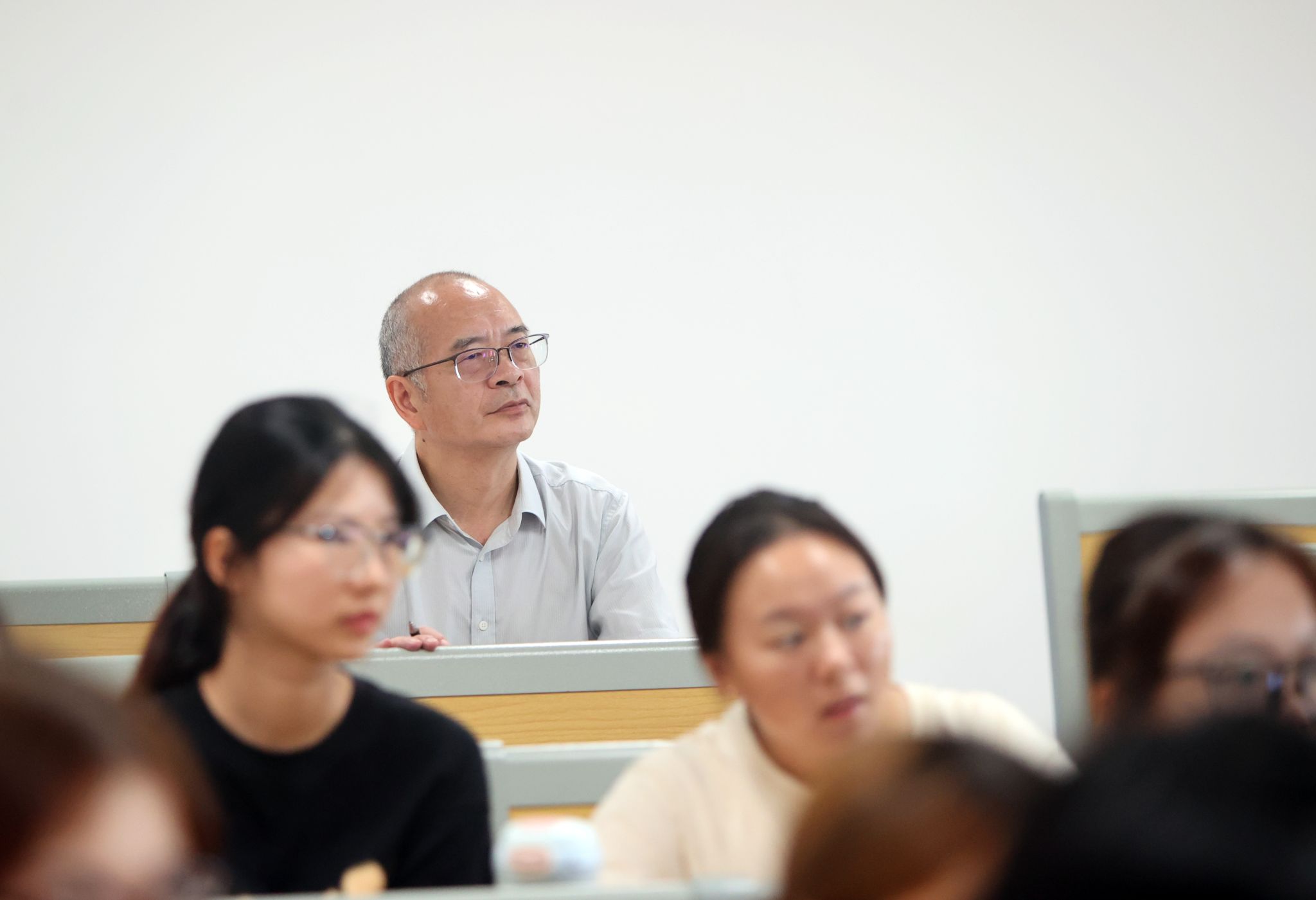 党委书记丁德智,党委副书记、副校长李海民分别听取了马克思主义学院教师马文明的《军事理论》与外国语学院彭慧副教授的《大学英语Ⅲ(一)》。丁德智一边听课一边认真记录,并在课后点评中指出,马文明老师的课程案例鲜活、数据详实,有效结合了时事热点,体现了思政课“因事而化、因时而进”的要求,同时建议进一步加强教学内容与大纲的精准对应,优化视频材料运用,以提升课堂讨论的深度。