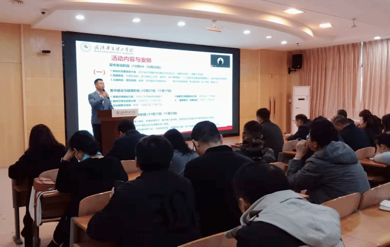 10月23日上午,我校在2-201教室召开学风建设月启动仪式暨迎评动员大会。校党委副书记、副校长李海民出席并作总结讲话,党委学生工作部及各学院学工办全体教师现场参会,梧桐湖校区学工队伍线上同步参加。会议由校团委书记、学工部副部长潘晶主持。