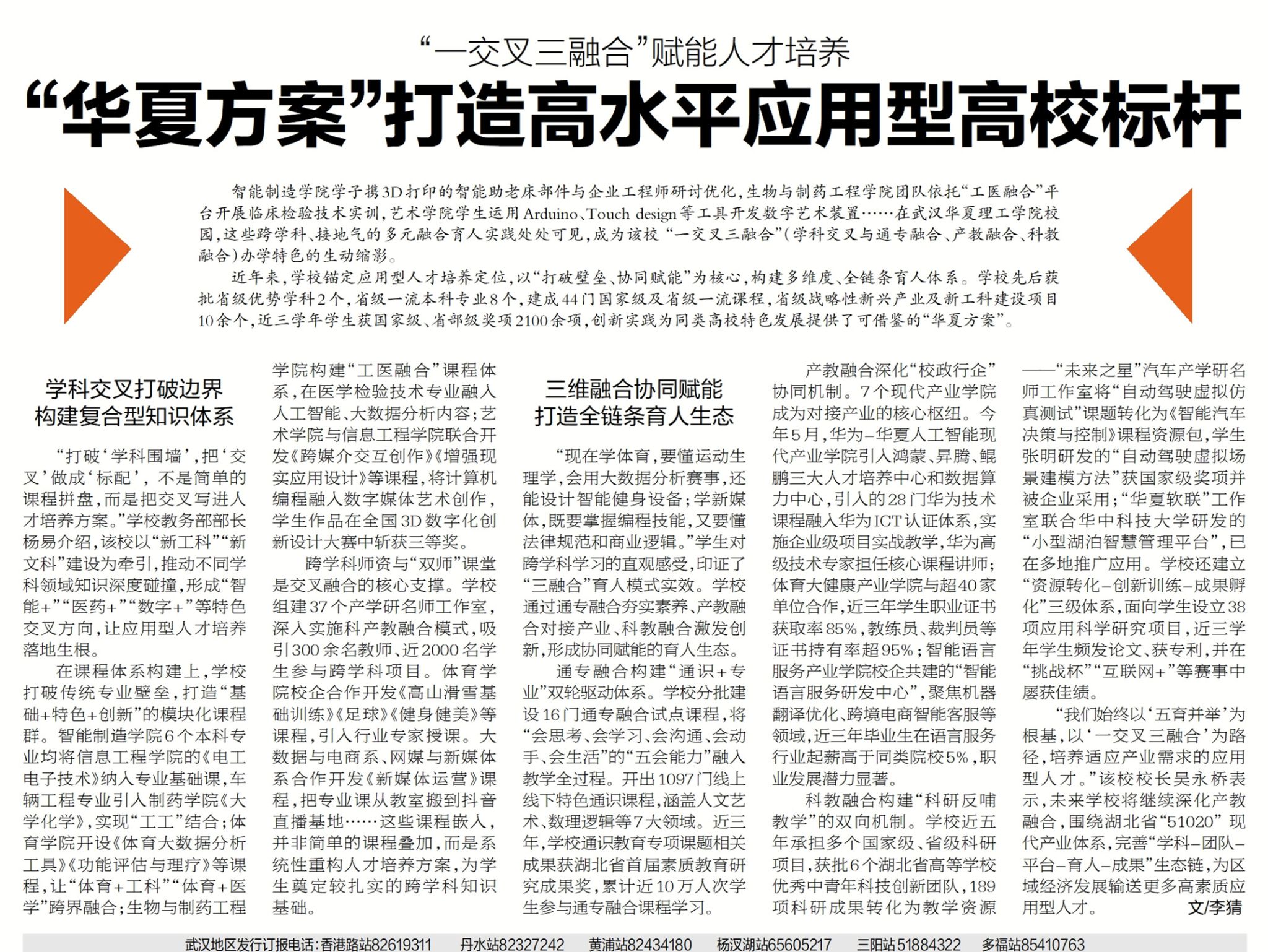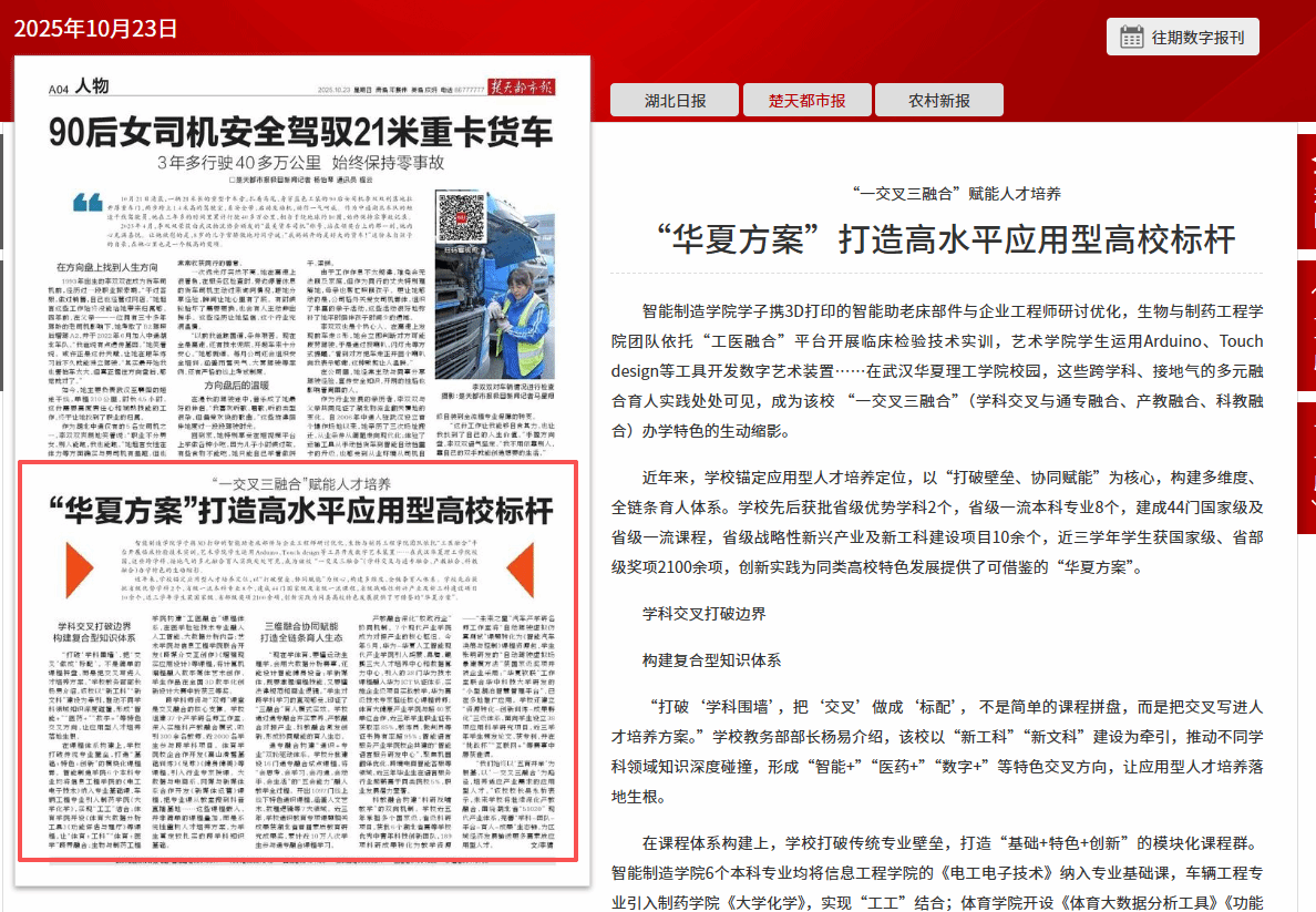 10月23日,《楚天都市报》第4版半版刊载我校副校长李猜文章《“一交叉三融合”赋能人才培养 “华夏方案”打造高水平应用型高校标杆》,对学校的办学特色予以全面深入的报道。