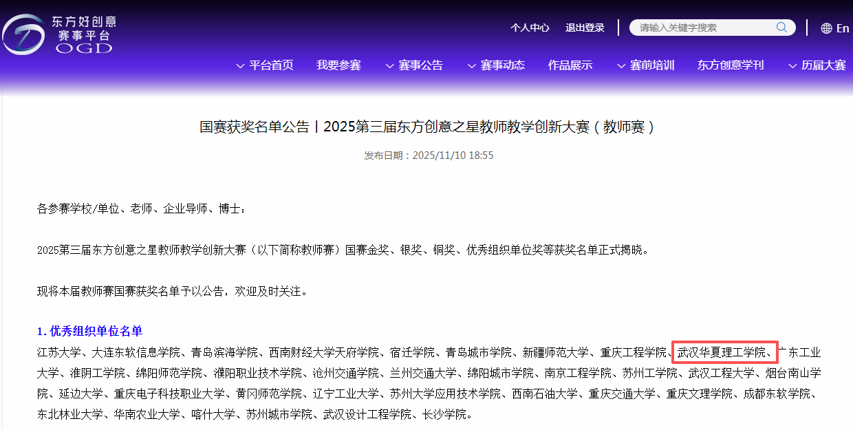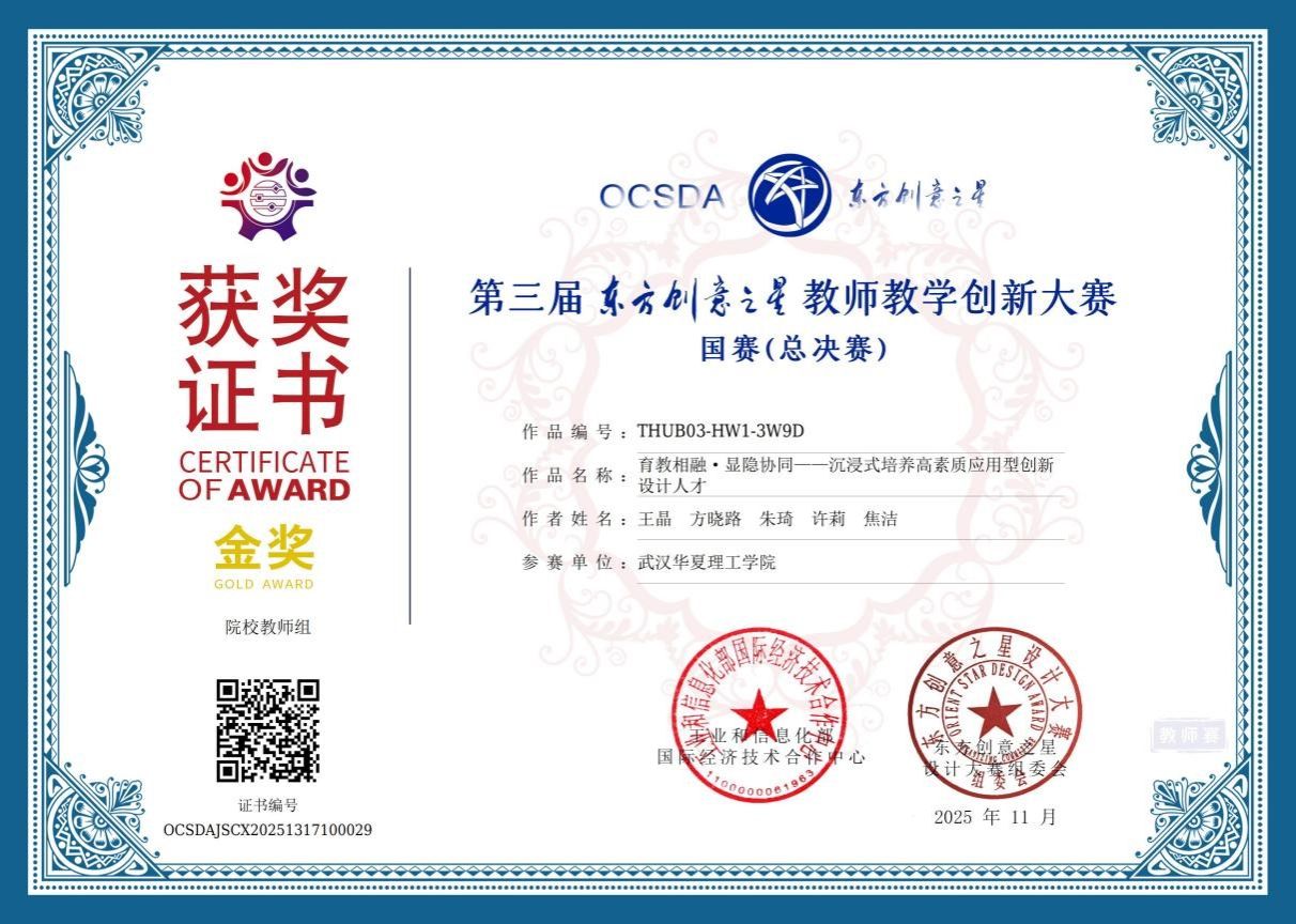 近日,2025东方创意之星教师教学创新大赛国赛在江苏大学举行。我校艺术设计与传媒学院教师团队在此次大赛中表现突出,一举夺得国家级金奖3项,银奖2项,铜奖4项。同时,学校凭借在大赛组织、作品征集、团队协作等方面的出色表现,荣获“国赛优秀组织单位”荣誉。