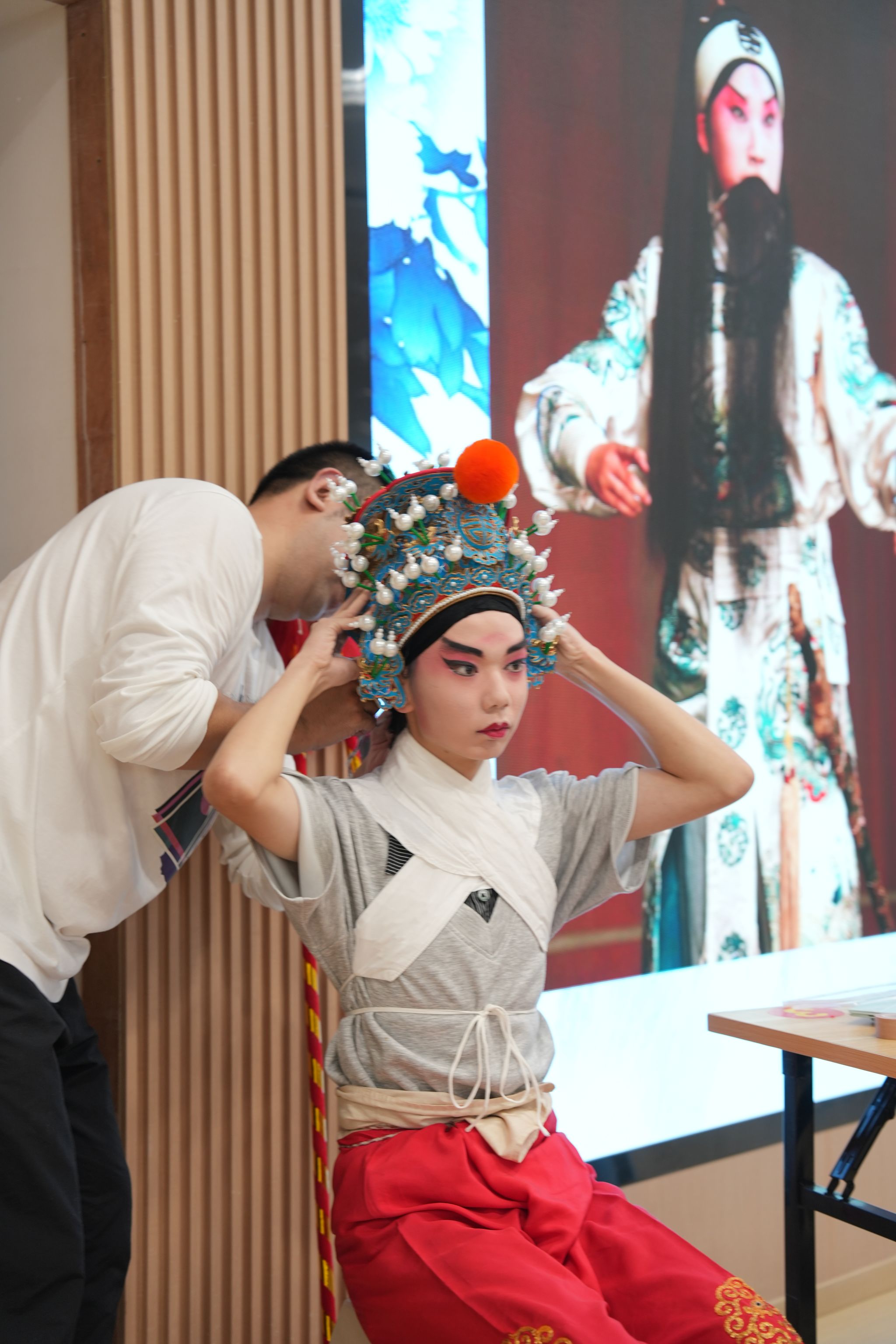 活动伊始,两名学生在王荔老师的邀请下登上舞台,由武汉汉剧院邱凌、彭冲老师现场进行汉剧妆容塑造和戏服穿戴。从描眉画目到整装束发,每一个细节都展现出汉剧艺术的精致与讲究。王荔老师在旁讲解道:"汉剧妆容讲究修容自然、打光配合角色气质,服饰配饰既要符合人物身份,又要保证演员表演的灵活性。"