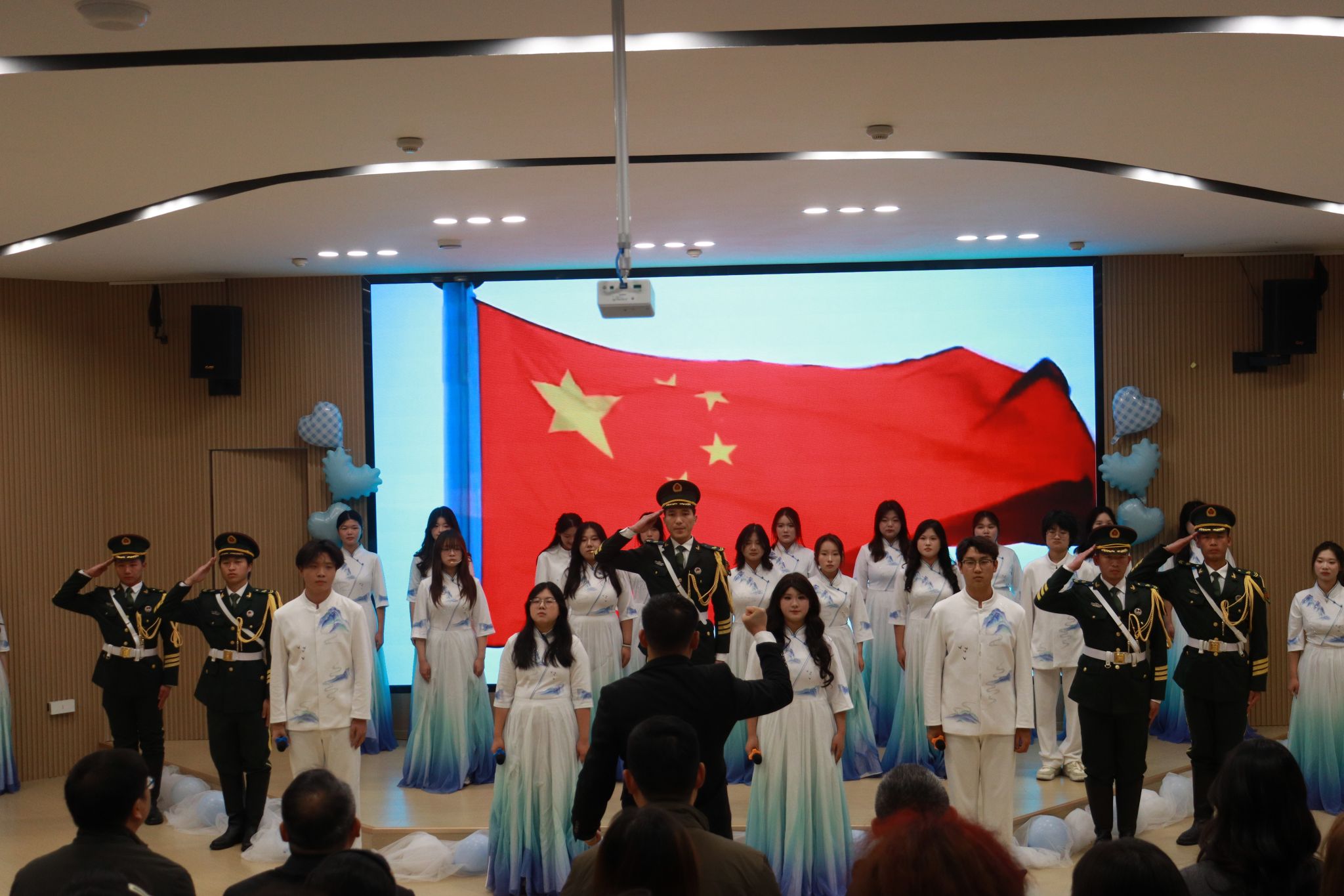 傍晚时分,所有队伍及观众齐聚学校多功能报告厅,举行闭幕暨颁奖仪式。大学生艺术团表演了铿锵有力的军歌《当那一天来临》。该节目由艺术团指导老师夏新明指导,从情感表达、声部配合到舞台表现都进行了细致打磨。激昂的旋律与饱满的和声点燃全场,展现了扎实的艺术功底与深沉的情感力量。随后,在校退伍军人代表以“若有战,召必回”的铮铮誓言,将现场气氛推向高潮,充分彰显了青年一代的爱国情怀与责任担当。