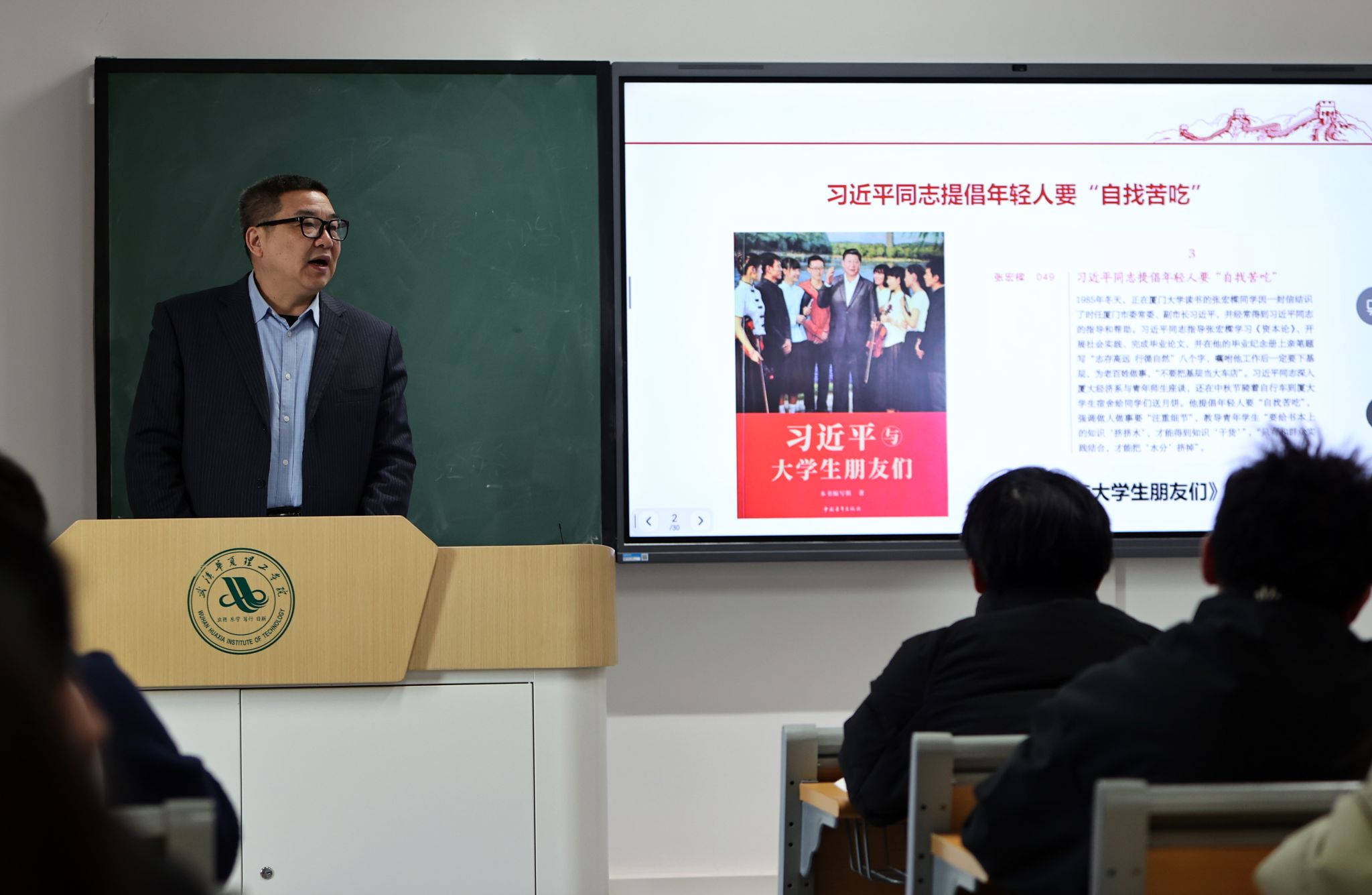 丁德智以“在‘自找苦吃’中绽放青春芳华”为题,引领学生回溯历史、观照现实。他讲述了习近平总书记青年时期扎根基层、带领村民建沼气池的实干足迹,以及“时代楷模”鲁军勇主动请缨、在艰苦环境中锻造国之重器的奋斗故事,阐释了“伟大源于平凡,成就始于吃苦”的道理。