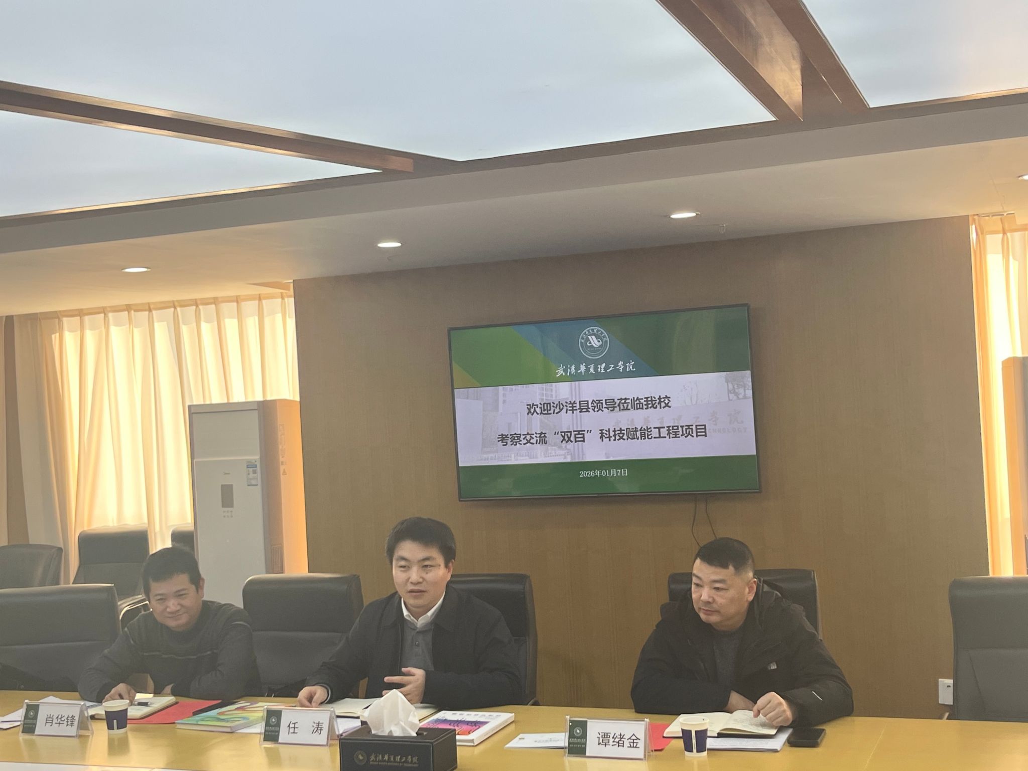 1月7日下午,沙洋县人民政府副县长任涛、科经局局长肖华锋、副局长谭绪金等县领导一行来我校考察交流。校地合作对接与产业融合发展交流会在综合楼1402会议室举行。副校长丁成忠,科研部部长张城芳,科研管理办公室主任戴伟及相关二级学院副院长等出席会议。会议由丁成忠主持。