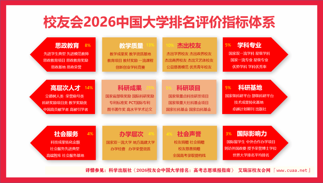 据了解,校友会2026中国大学排名评价指标体系由办学层次、思政教育、教学质量、高层次人才、杰出校友、学科专业、科研基地、科研项目、科研成果、社会服务、社会声誉和国际影响力等12大一级指标组成,基于“大平台、大团队、大项目、大成果、大校友”体系框架展开系统评价,涵盖的评价指标达900多项。
