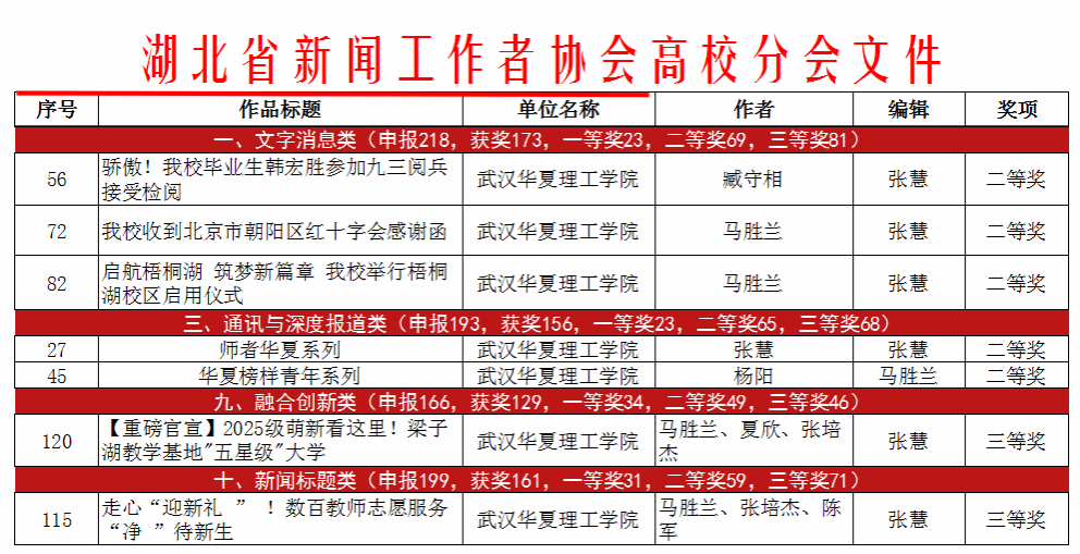据悉,湖北省高校新闻奖由湖北省新闻工作者协会高校分会主办,具有高度的专业性与权威性。该评选每年举行一次,旨在展示全省高校新闻宣传工作的优秀成果。本届评选共设立文字消息、文字评论、通讯与深度报道、版面与版面设计、新闻标题、新闻摄影、副刊等11个类别。