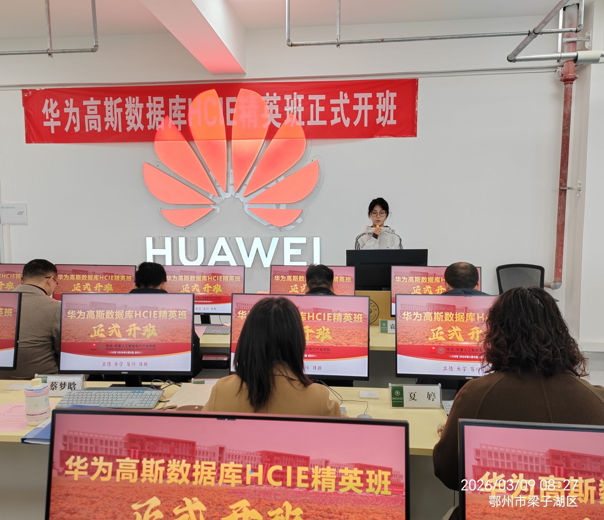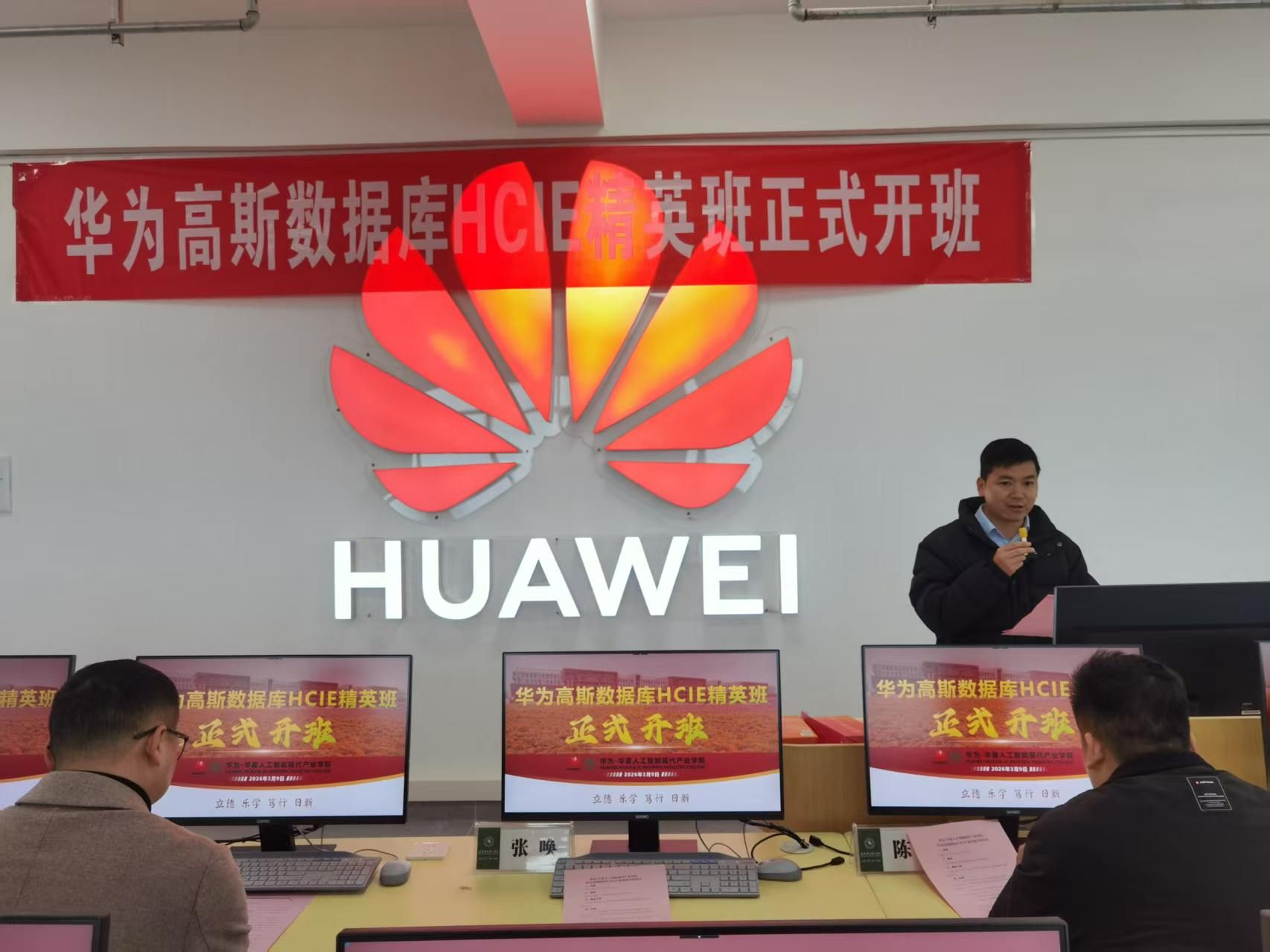 3月7日上午,华为-华夏人工智能现代产业学院携手华为技术有限公司、嘉环科技联合举办的华为高斯数据库HCIE精英班开班仪式,在梧桐湖校区601实训室举行。开班仪式由计算机与网络工程系教师谭采薇主持。华为湖北政企业务部教育客户经理张唤,华为企业培训认证部院校客户经理陈飞,嘉环科技教育事业部华中区总监陈冲,我校教务部常务副部长项金辉、华为-华夏人工智能现代产业学院院长夏婷等校企双方骨干教师出席。