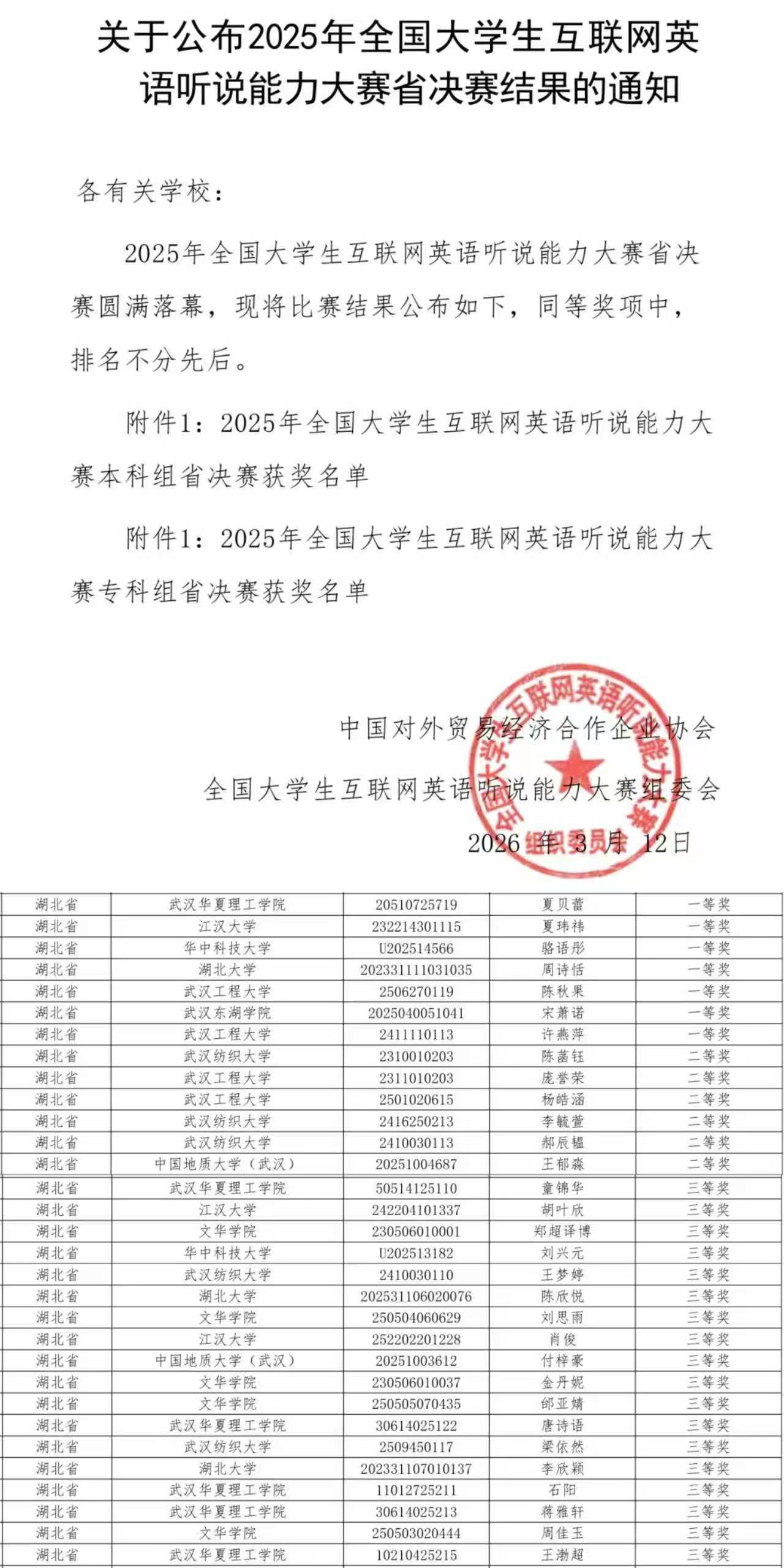 在2025年12月20日至27日举行的湖北省初赛中,我校严格按照大赛组委会要求,组织来自多个学院的学生通过SOEASY智能外语APP参赛,全程规范管理,确保选拔过程公平公正。赛事得到全校学生的积极响应,参赛选手积极备赛,在培训和模拟演练中展现出浓厚的学习热情。经过激烈角逐,吴胜欣、童锦华等20名选手荣获初赛一等奖,59名选手获二等奖,117名选手获三等奖。其中,夏贝蕾、唐诗语等9名选手凭借优异表现成功晋级省决赛。