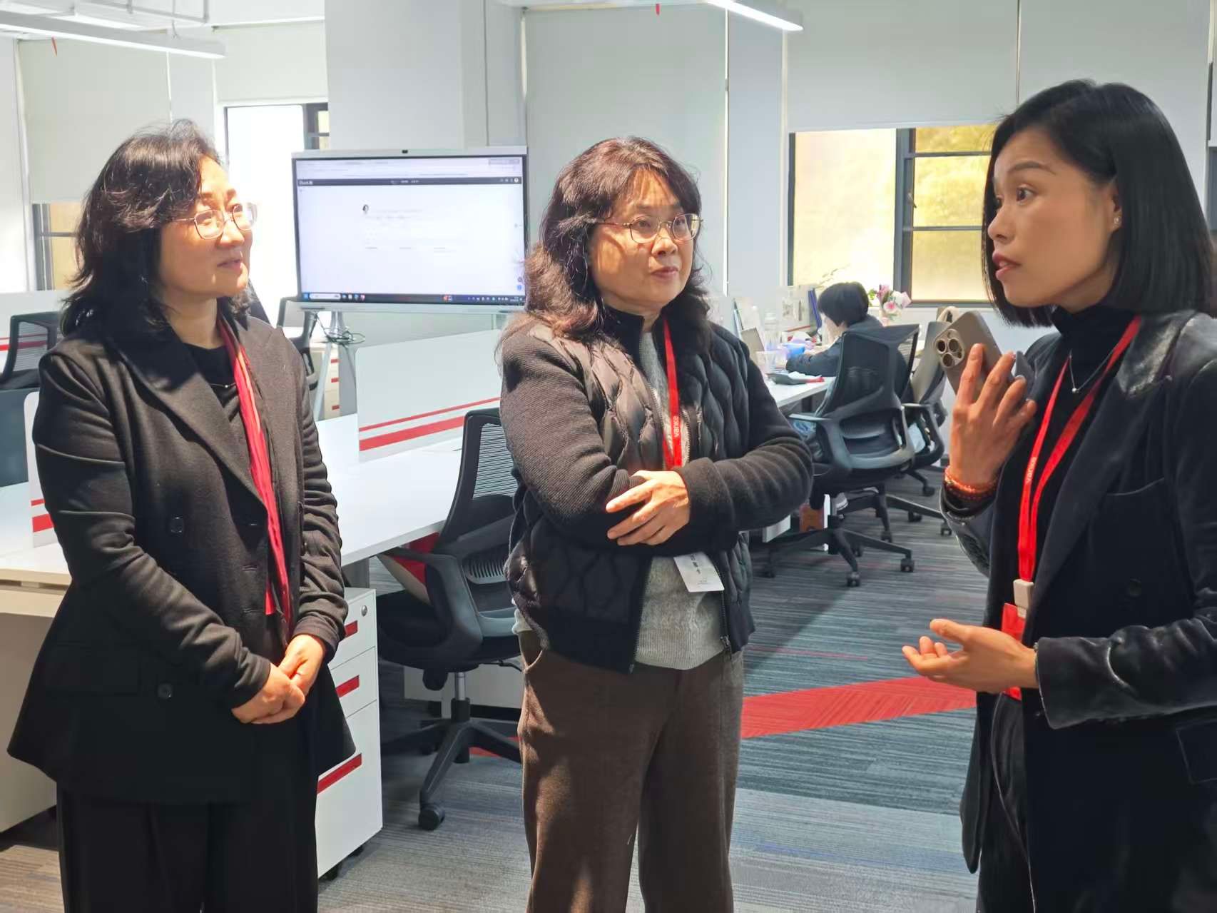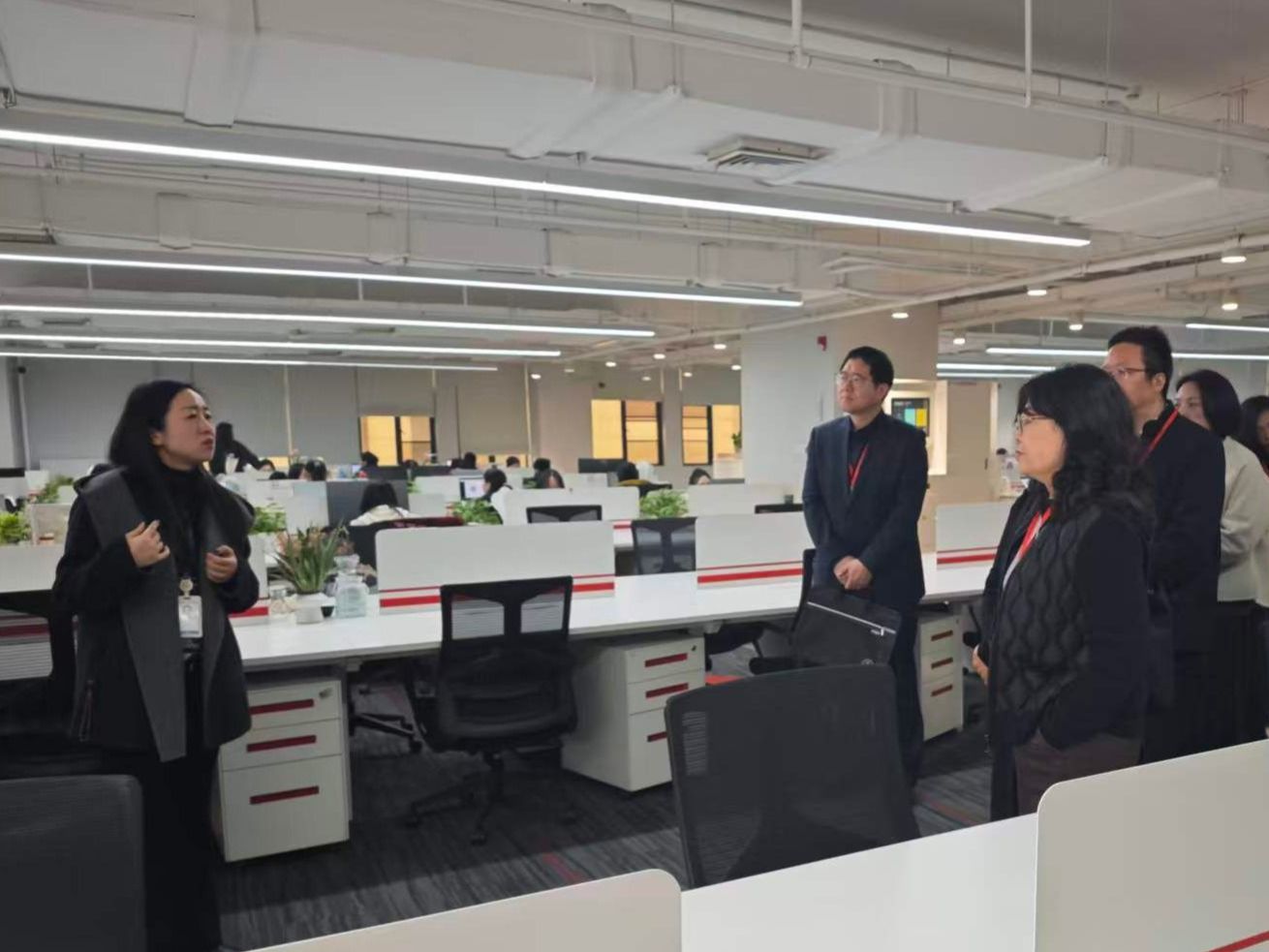 我校一行在企业代表陪同下实地参观了企业智慧监控大屏、运营数据看板、AI客服与AI报销产品展示区以及员工活动区,深入了解企业在财务数字化、智能化管理方面的创新成果与企业文化建设情况。