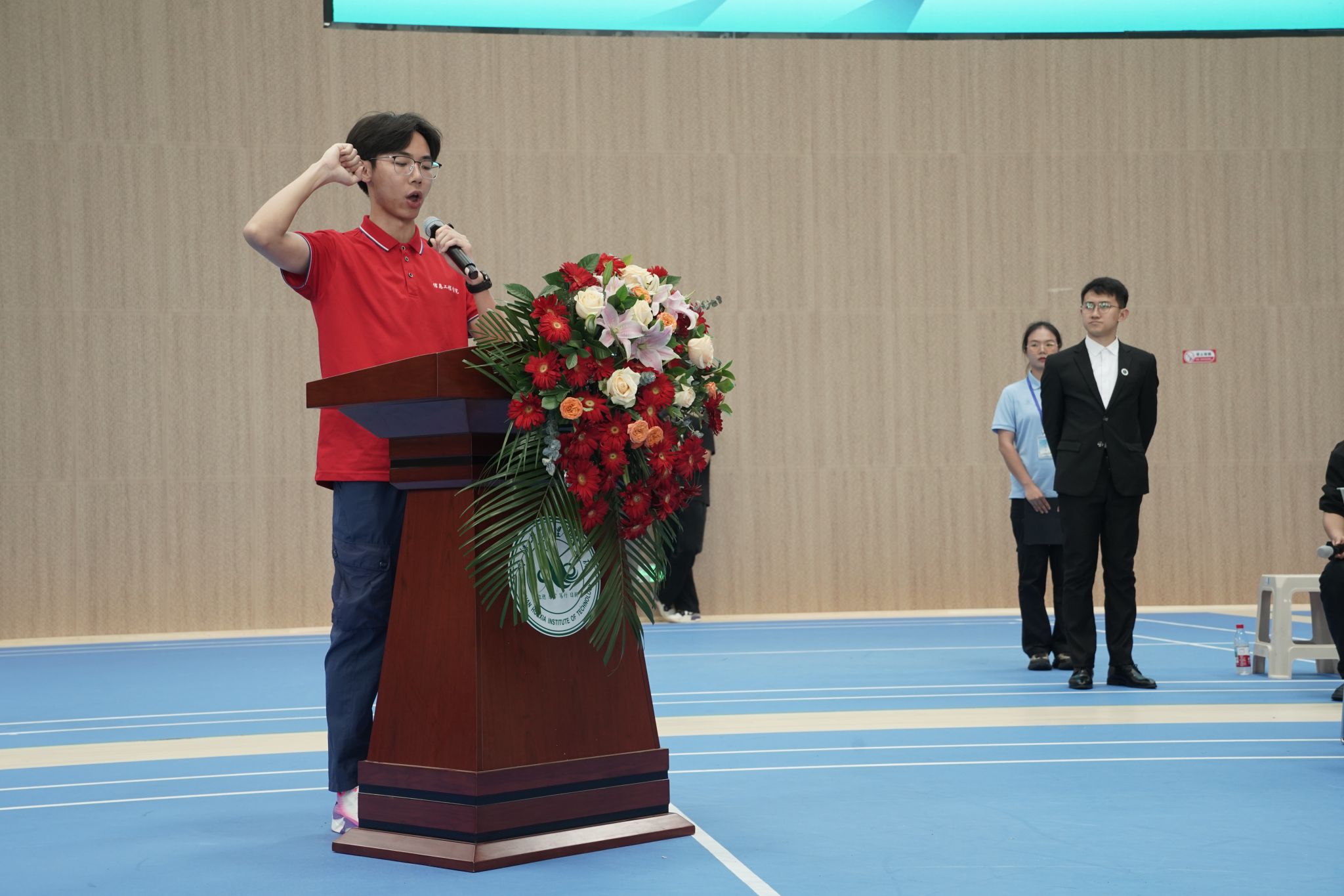 随后,运动员代表、信息工程学院廖汪其同学和裁判员代表、体育学院王琦薇老师分别进行了庄严宣誓。