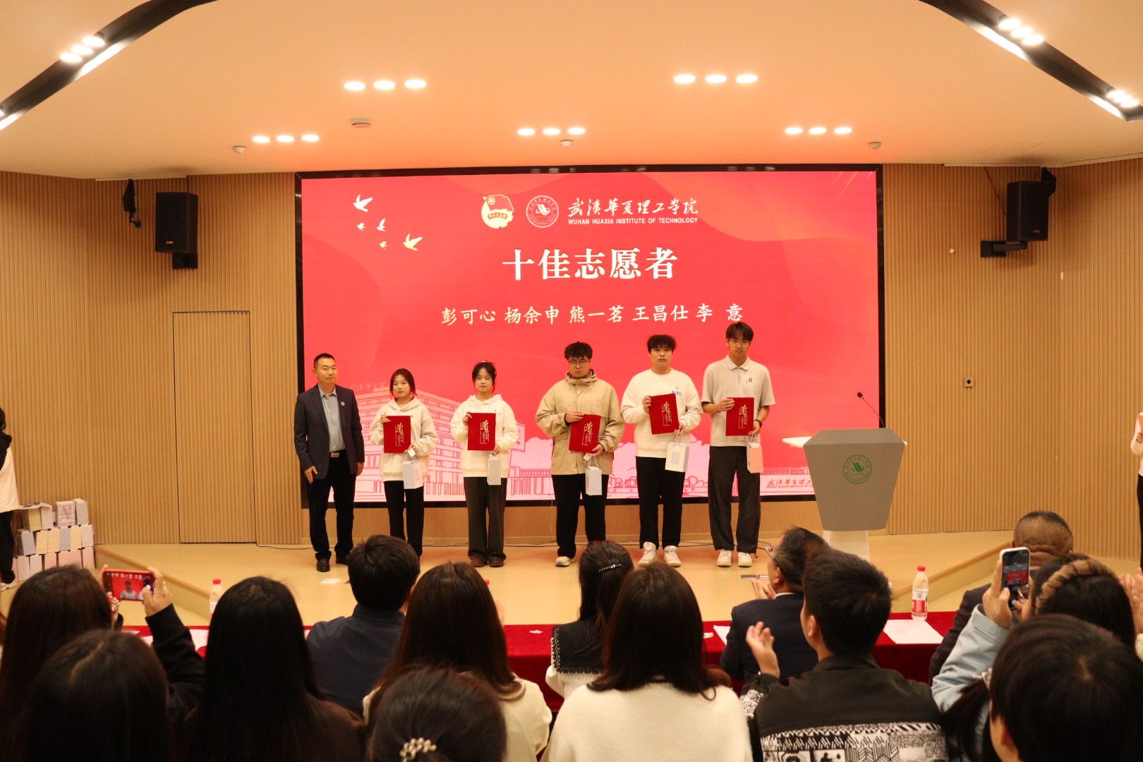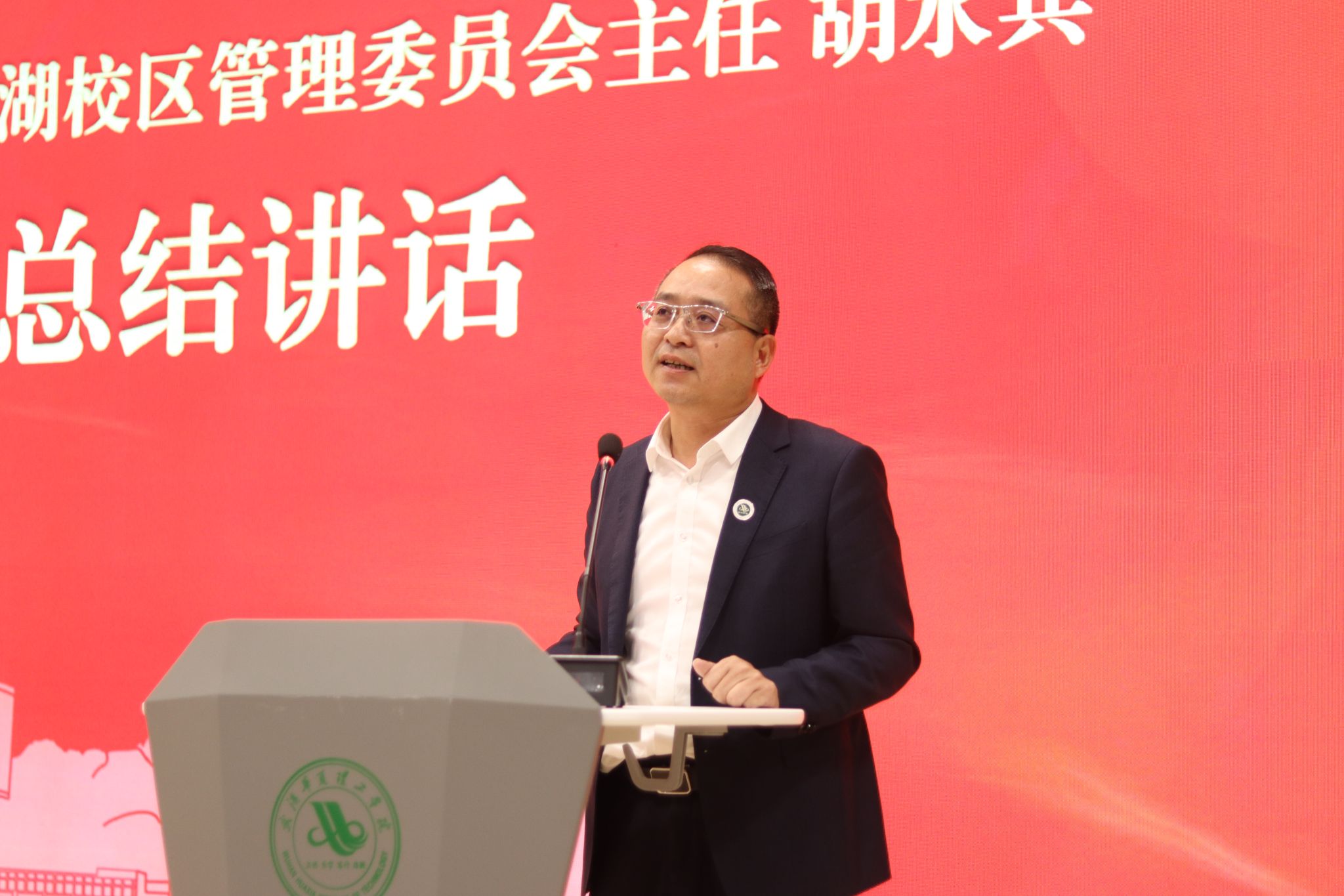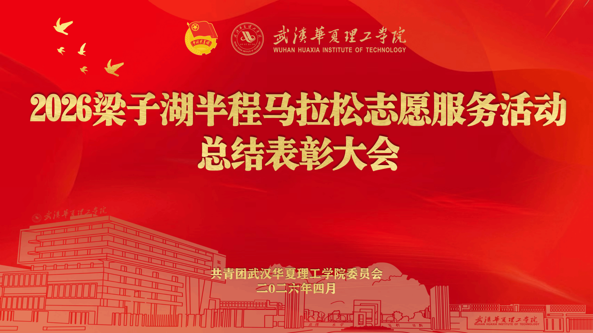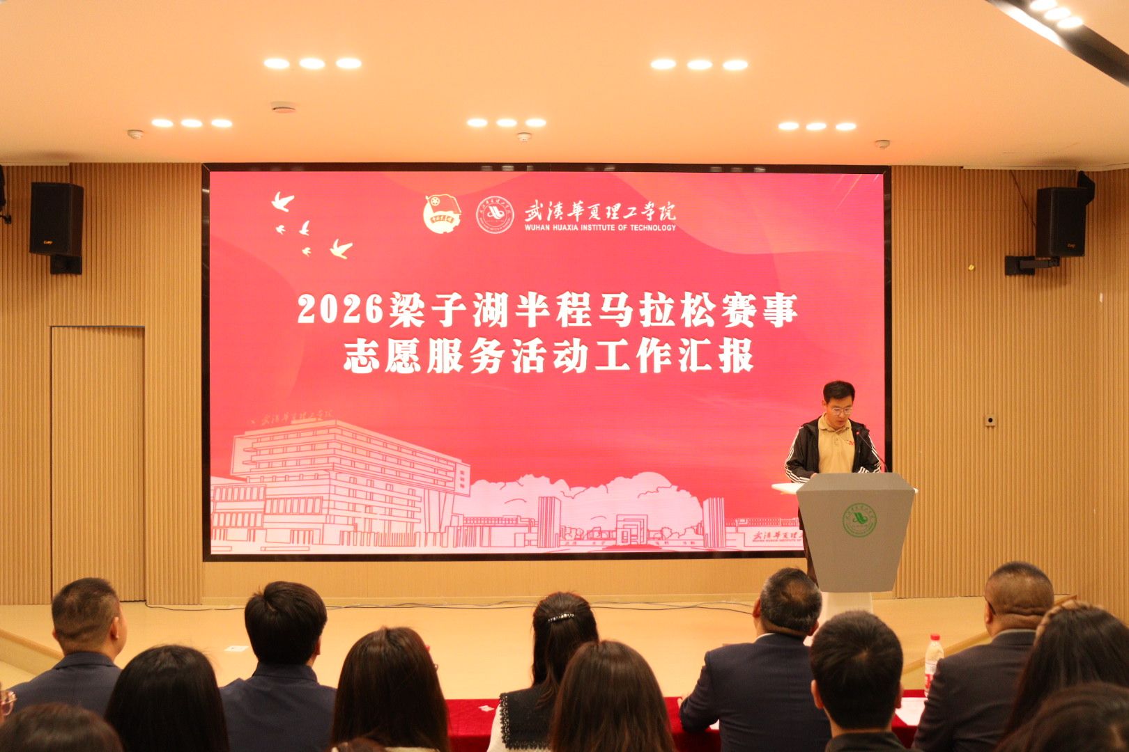 4月22日晚,我校在梧桐湖校区教学楼一楼多功能报告厅举行2026梁子湖半程马拉松志愿服务总结表彰大会。副校长、梧桐湖校区管委会主任胡水兵,梧桐湖校区管委会副主任项金辉、张城芳、黄程,管委会综合办公室主任张勇、副主任孙华,学生服务中心主任郝志康,校团委副书记史贵鹏,全体辅导员及志愿者代表参加大会。