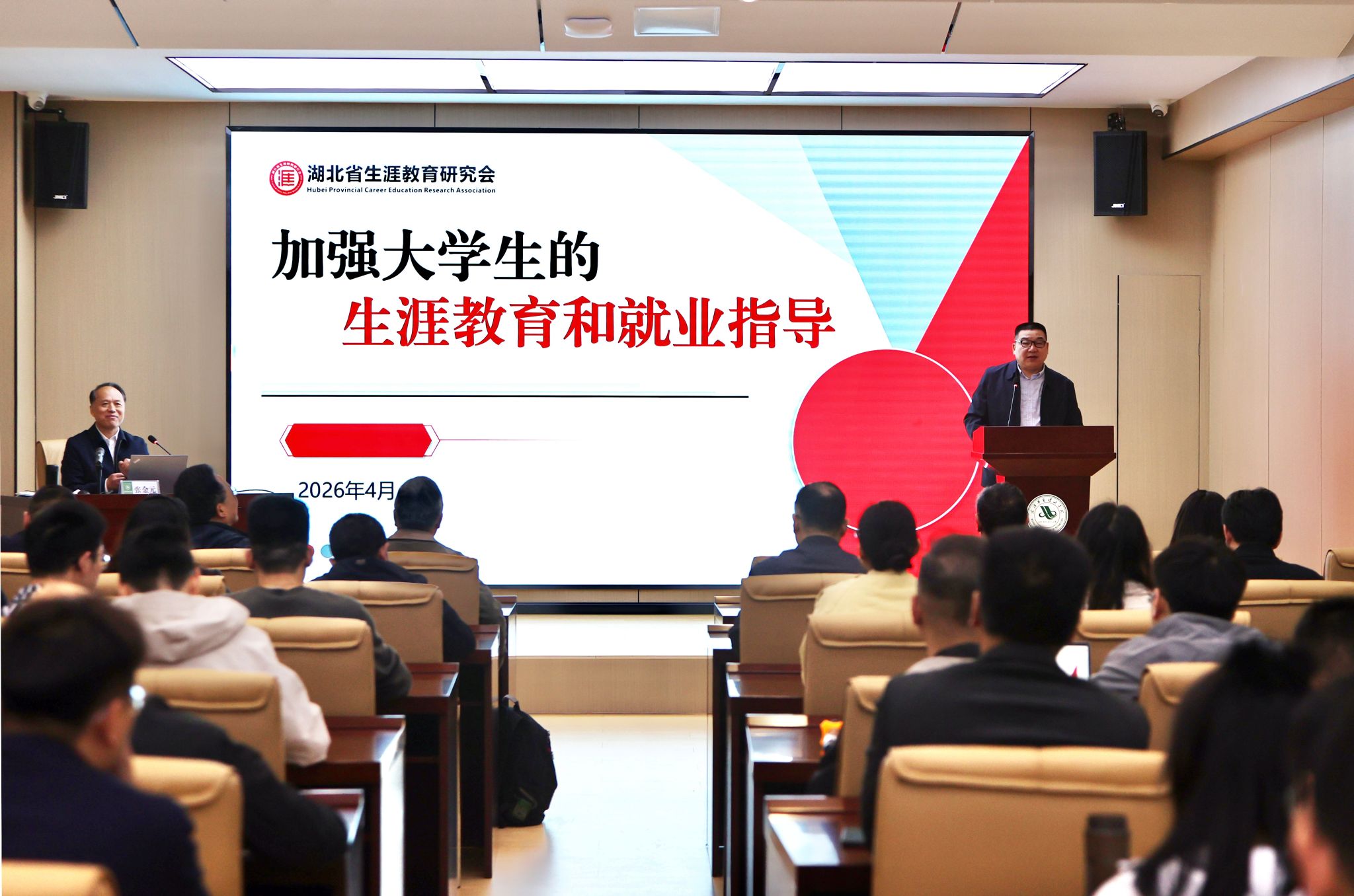 上午,张金元在图书馆多功能厅作题为《加强大学生的生涯教育和就业指导》的专题讲座。校党委书记丁德智主持。湖北省生涯教育研究会副会长周则顺、副秘书长姜新华等研究会成员,学校党委副书记、副校长李海民,校长助理、招生办公室主任赵杨,各职能部门负责人、各学院党总支书记、党总支组织员、学工办主任、全体辅导员,以及就业指导、生涯规划、创新创业课程教师参加。